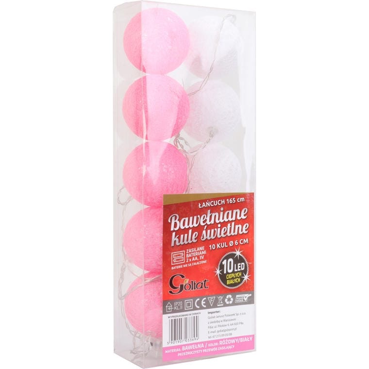 10 Bawełnianych Kul Świetlnych LED 6 cm, Różowo-Białe, z Bateriami, Ciepłe Białe Światło