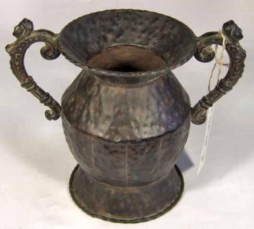 Amfora z metaloplastyki w kolorze brązowym z uszami oraz kutym wzorem