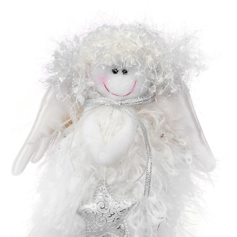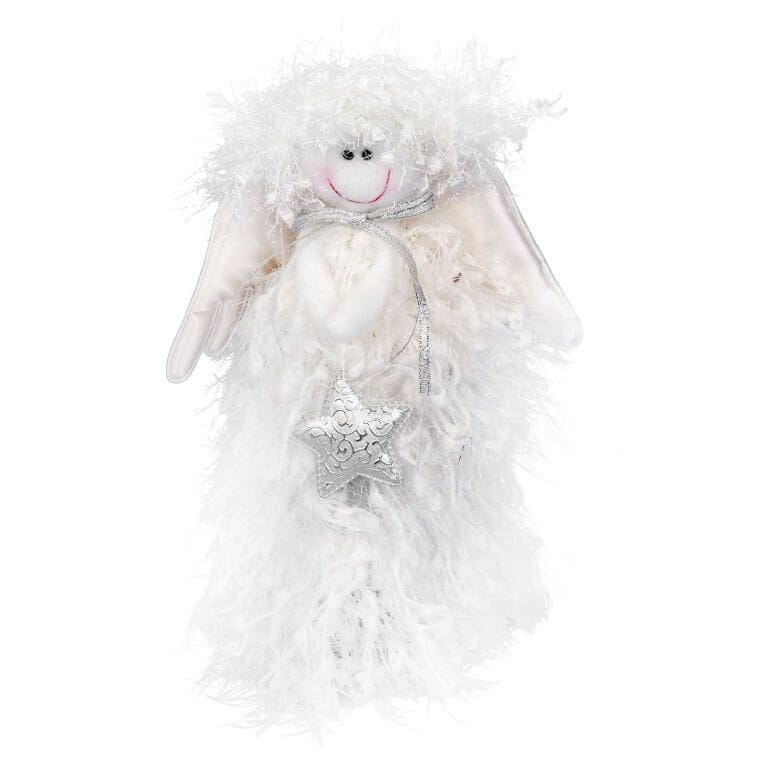Aniołek Stojący z Włóczki ze Srebrną Gwiazdą 25cm – Figurka Choinkowa/Białe Świąteczne Dekoracje