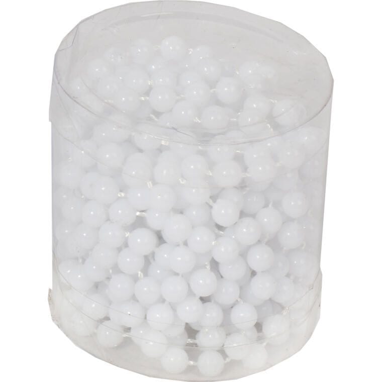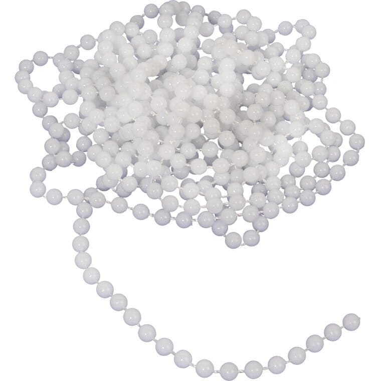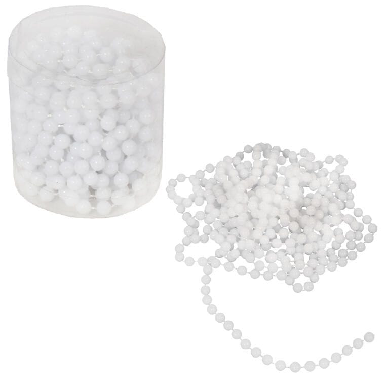 Korale dekoracyjne na szpuli, w eleganckim białym kolorze. Długość korali to 4 metry, a średnica pojedynczej koraliki wynosi 6 mm. Idealne do ozdabiania choinek, stroików, a także do różnorodnych świątecznych aranżacji i dekoracji wnętrz.