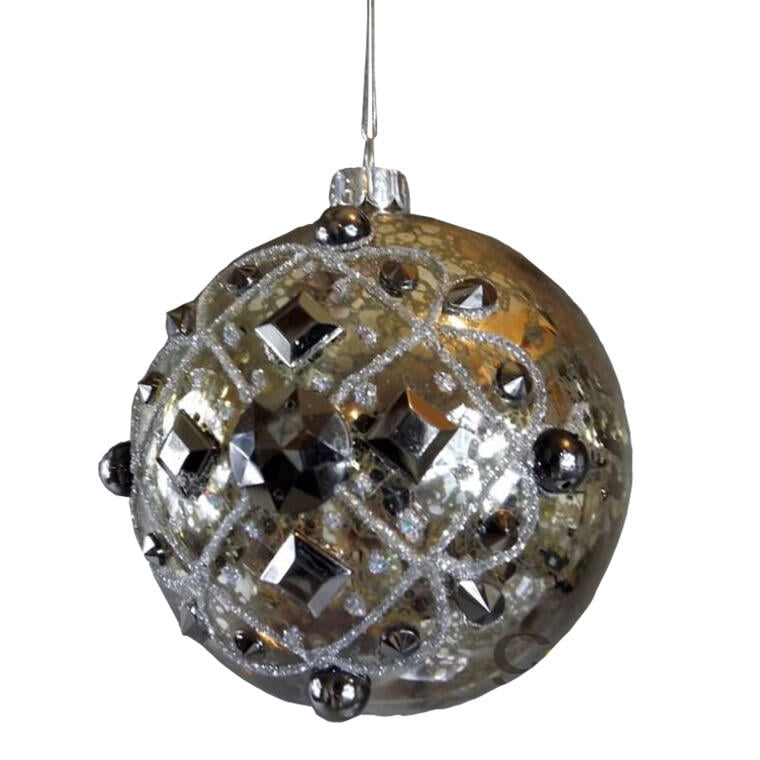 Bombka srebrna zdobiona szkiełkami i metalem 9cm