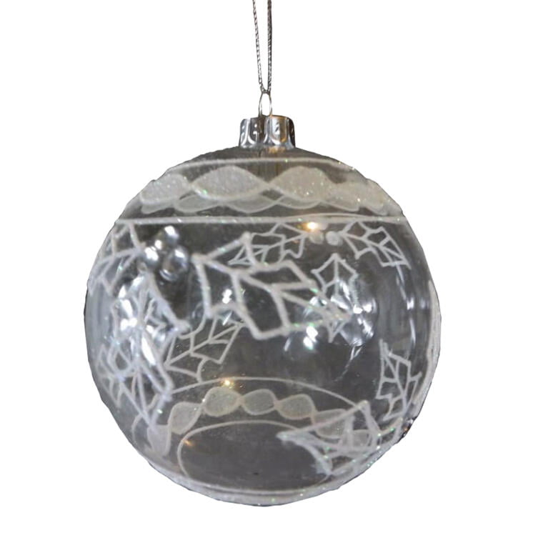 Bombka szklana przezroczysta z białym opalizującym dekorem i szkiełkami