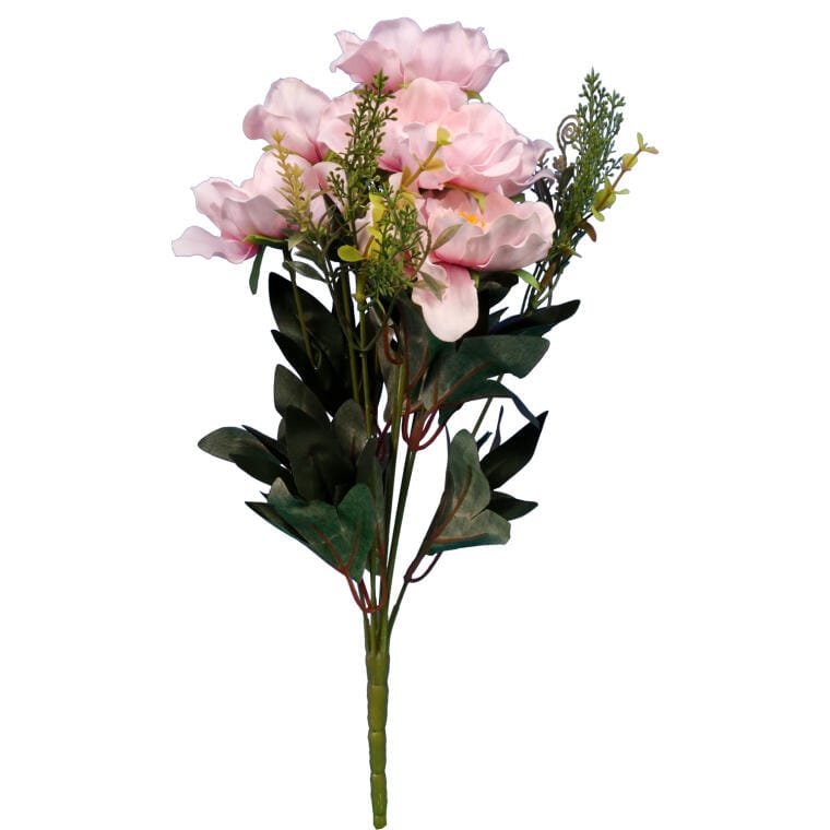 O wysokości 42 cm, bukiet doskonale sprawdzi się jako samodzielna ozdoba w wazonie, ale może też stanowić efektowną bazę do większych kompozycji florystycznych. Wykonany z materiałów wysokiej jakości, kwiaty wyglądają niezwykle realistycznie, zapewniając trwałość piękna przez długi czas bez potrzeby pielęgnacji. To elegancka propozycja na każdą okazję, zarówno do wnętrz, jak i jako dekoracja nagrobna.
