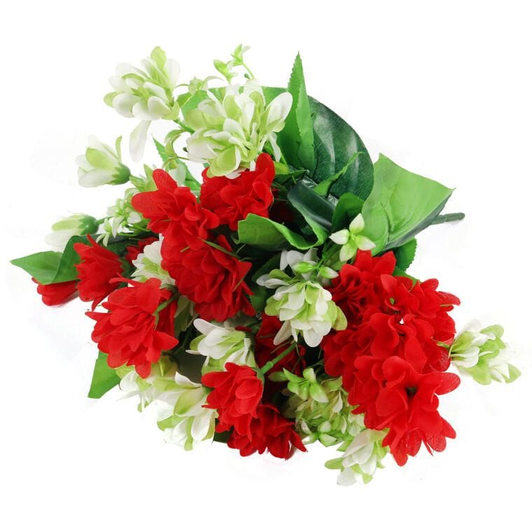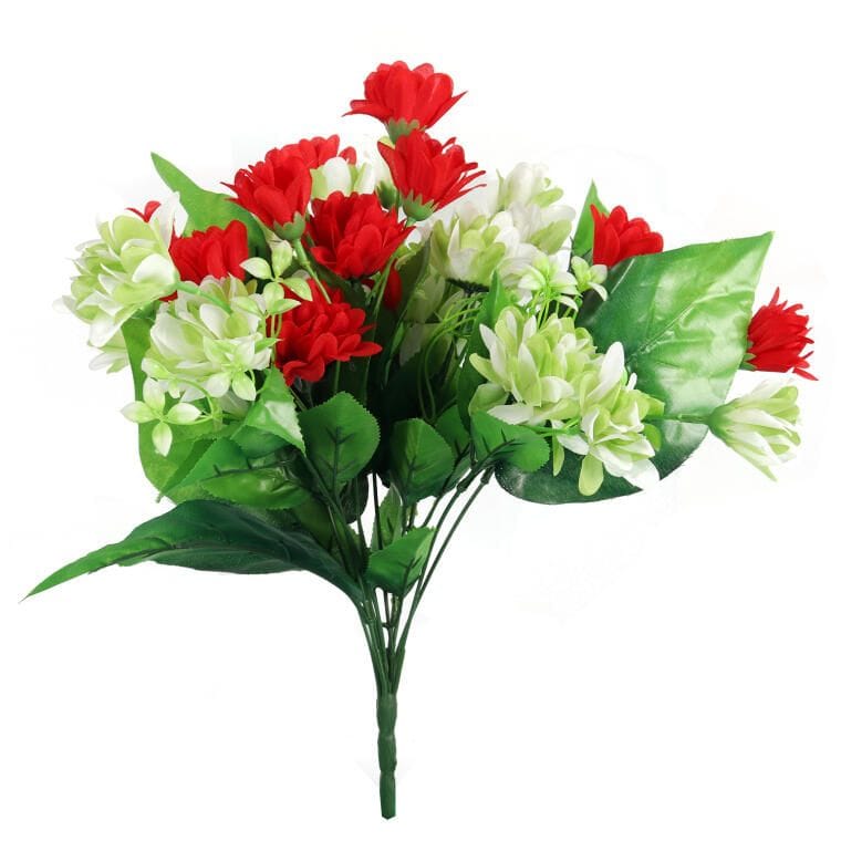 BUKIET 12 DROBNYCH DALII Z DUŻYMI LIŚĆMI 42 CM CZERWONO ZIELONY