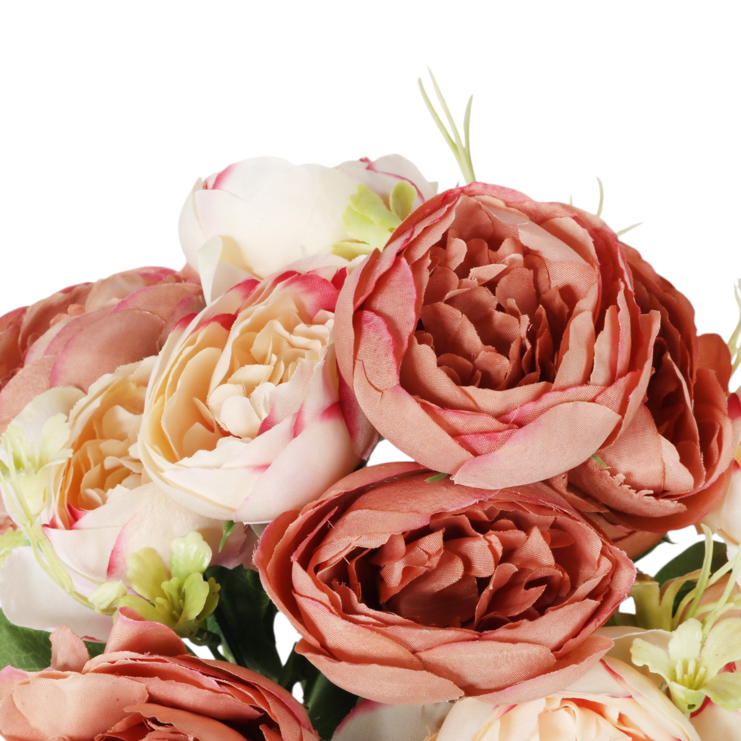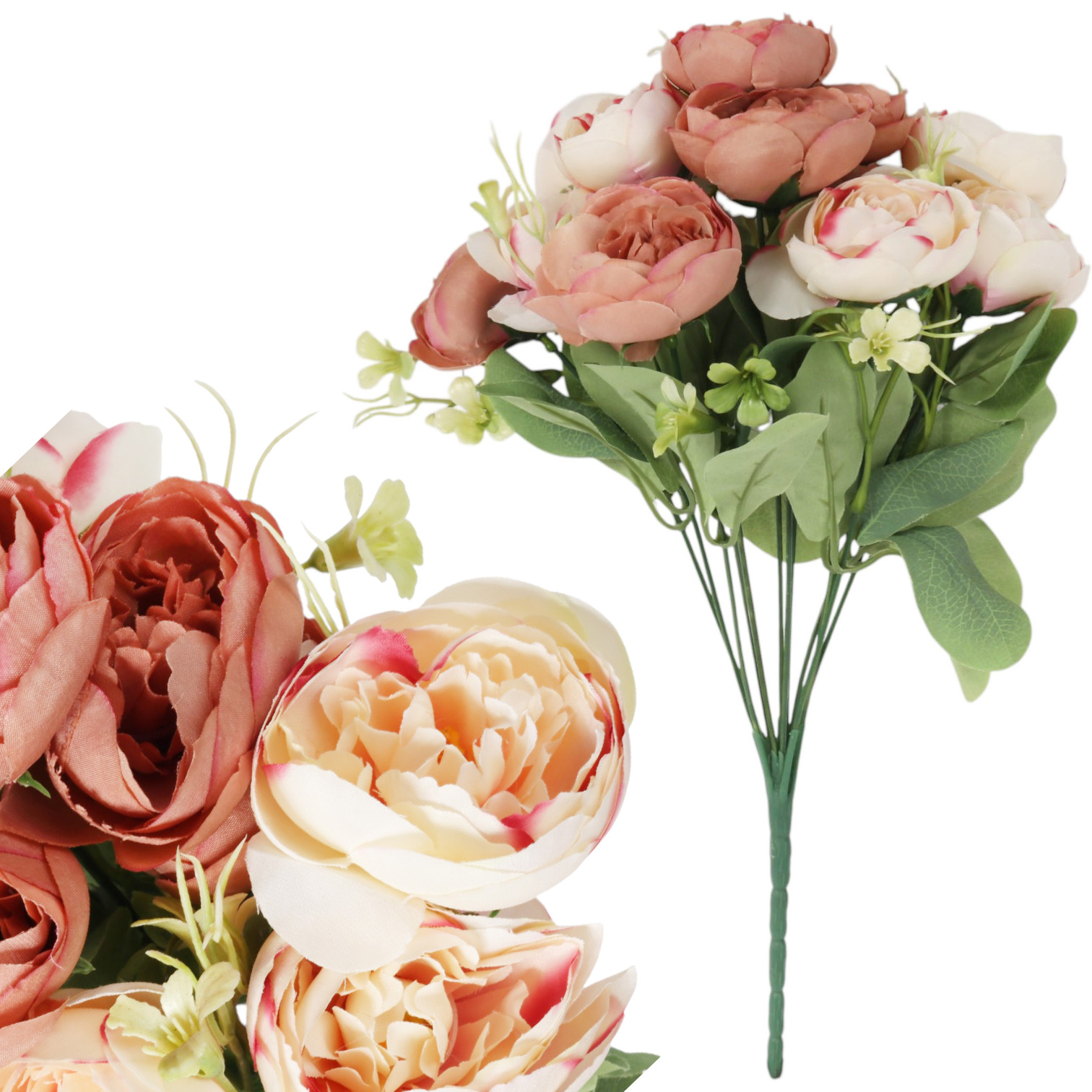 Kompozycja z piwonii: francuska, rustykalna oraz szalenie elegancka dekoracja wykonana z wysokiej jakości materiału, który sprawia, że kwiaty do złudzenia przypominają żywe. Idealna jako samodzielna ozdoba lub element kompozycji kwiatowych, wprowadza do wnętrza subtelny kolor i wyjątkowy urok. Trwała, estetyczna i efektowna, doskonale udekoruje salon, sypialnię, biuro lub restaurację. Wysokość: 36cm, fi 1 kwiatka 6cm