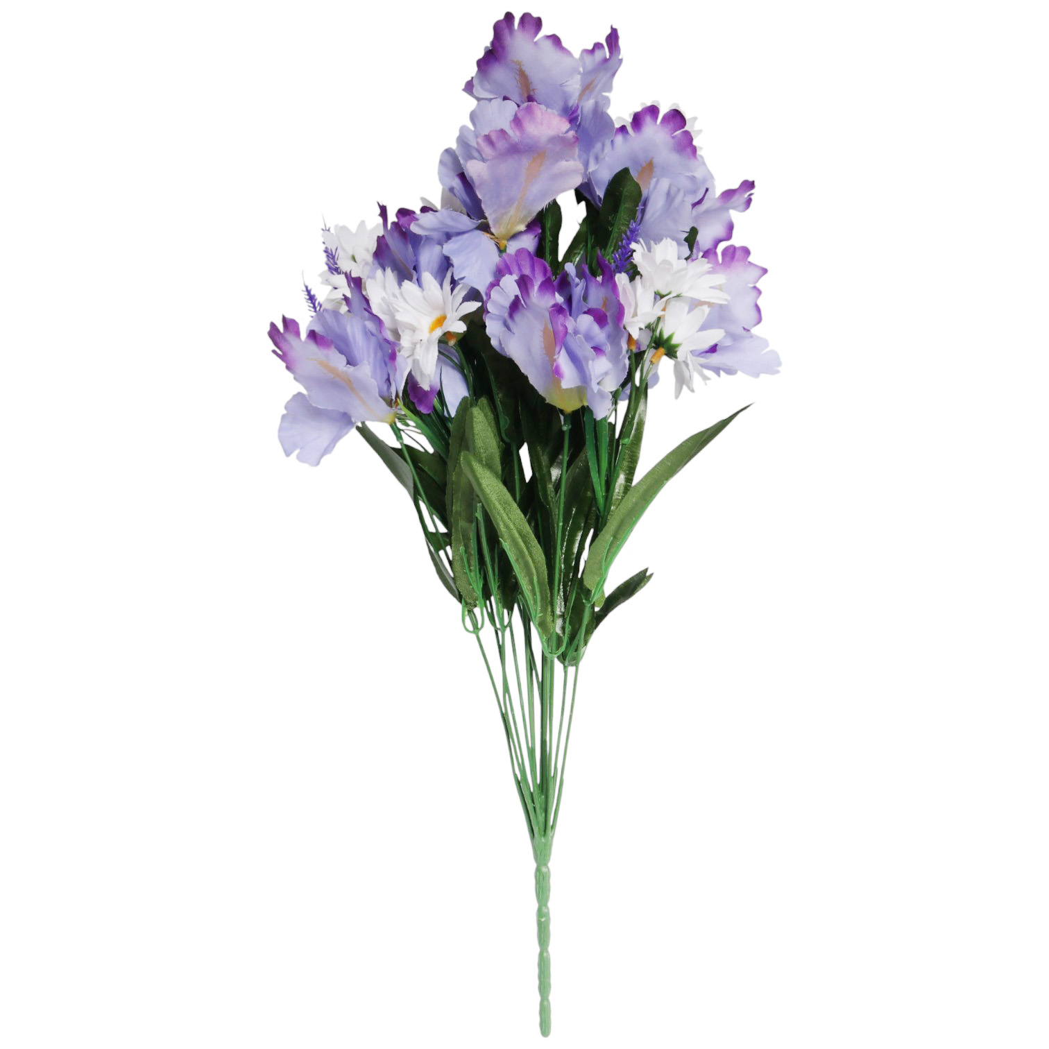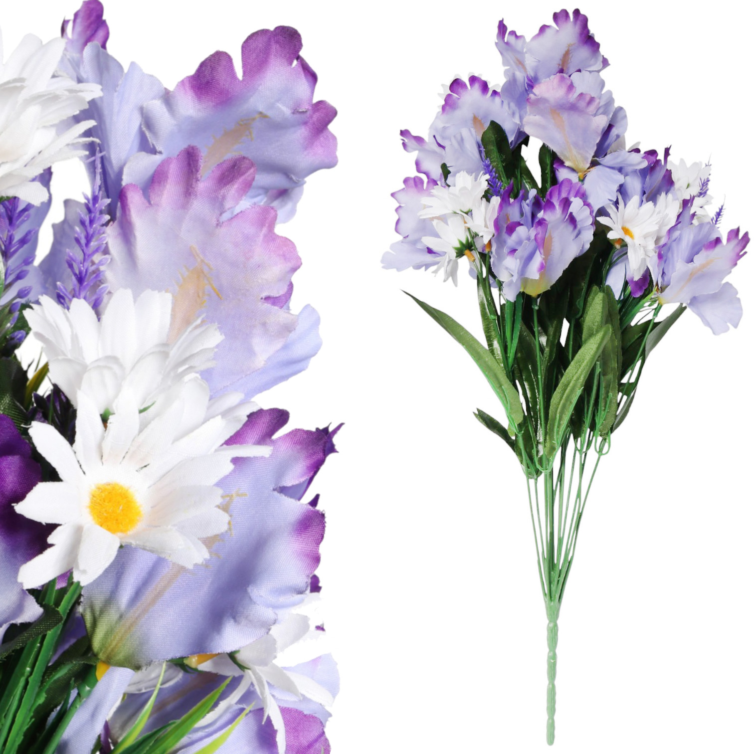 Bukiet sztuczny złożony z 14  irysów z margaretkami i dodatkami o wysokości 50 cm to wyjątkowa dekoracja, która zachwyca elegancją i naturalnym wyglądem. Wykonany z wysokiej jakości materiałów, do złudzenia przypomina żywe kwiaty, dzięki czemu wprowadza do wnętrza ciepło, przytulność i świąteczny klimat. Bukiet doskonale prezentuje się jako samodzielna ozdoba w wazonie, a także jako element większych kompozycji, stroików czy dekoracji wiosennych, podkreślając ich wyjątkowy charakter. Intensywne kolory kwiatów pięknie komponują się z różnorodnymi dodatkami, tworząc efektowną całość pasującą zarówno do nowoczesnych, jak i tradycyjnych wnętrz. To ponadczasowa dekoracja, która nie wymaga pielęgnacji, a jednocześnie gwarantuje trwały i elegancki efekt wizualny przez wiele sezonów.