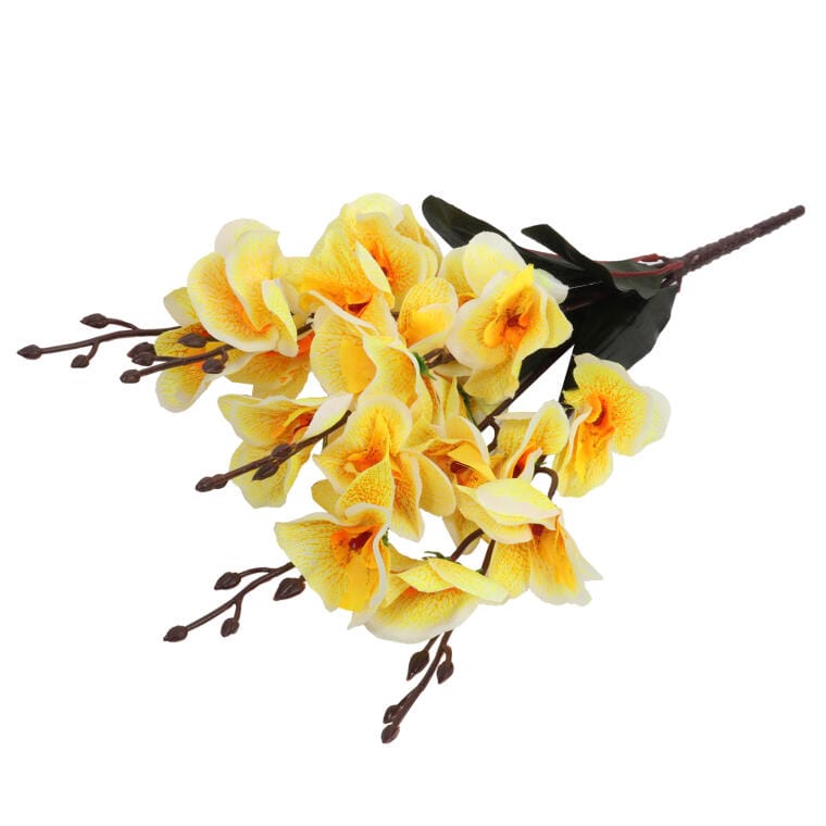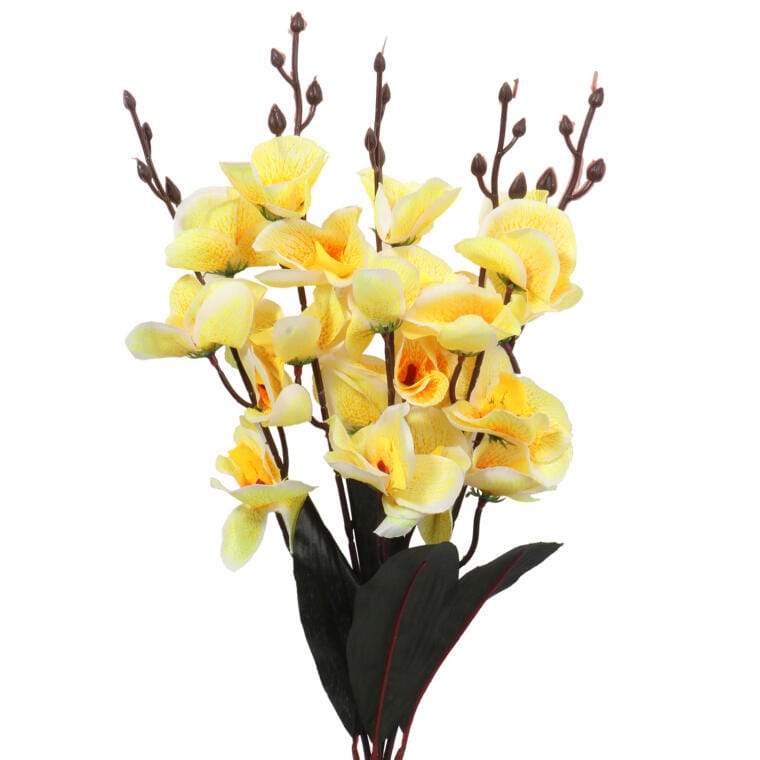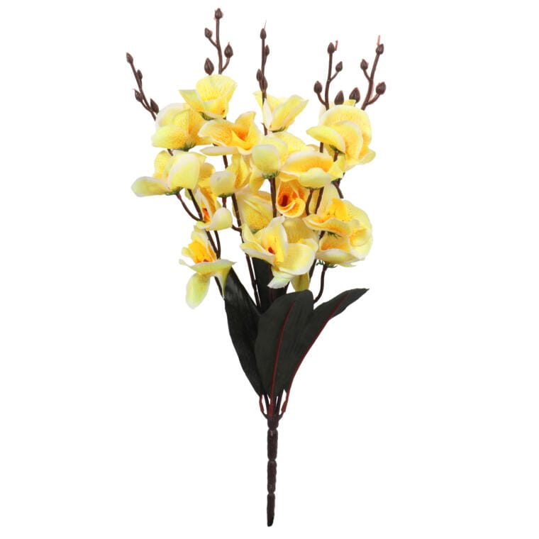 Sztuczny bukiet 5 storczyków w intensywnym żółtym kolorze to doskonała propozycja dla osób pragnących wzbogacić swoje wnętrze o elegancką i trwałą dekorację. Wykonany z materiałów najwyższej jakości, bukiet ten do złudzenia przypomina prawdziwe kwiaty, co czyni go idealnym wyborem zarówno jako samodzielny element ozdobny, jak i część większych kompozycji florystycznych.  Ten wyjątkowy bukiet o długości 38 cm doskonale sprawdzi się w wazonie na stole, półce czy jako dekoracja w biurze, dodając świeżości i stylu do Twojego otoczenia. Jego uniwersalny charakter pozwala na dopasowanie do różnych stylów aranżacyjnych, od nowoczesnych po klasyczne. Wybierając sztuczne storczyki, zyskujesz nie tylko efektowną dekorację, ale również produkt, który nie wymaga specjalnej pielęgnacji, a jego piękno pozostaje niezmienne przez długi czas. Ten bukiet to idealne rozwiązanie na każdą okazję, wprowadzające radość i kolor do każdego wnętrza, a także doskonały prezent dla bliskich, którzy cenią sobie eleganckie dodatki.