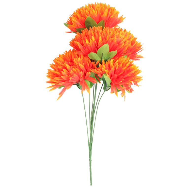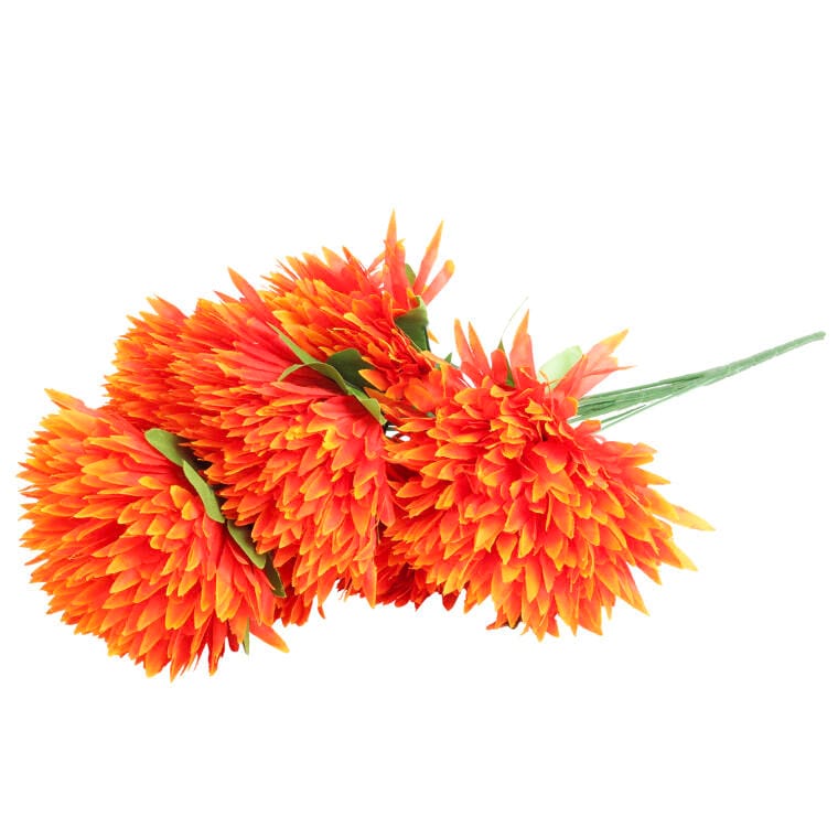 Sztuczny bukiet 7 chryzantem strzępiastych w kolorze pomarańczowym to efektowna dekoracja, która dzięki wysokiej jakości materiałom doskonale imituje żywe kwiaty. Intensywny pomarańczowy odcień wprowadza radość i ciepło, czyniąc bukiet idealnym wyborem do ozdabiania miejsc pamięci, szczególnie podczas święta Wszystkich Świętych. Bukiet o wysokości 54 cm świetnie sprawdzi się zarówno jako samodzielna ozdoba, jak i w kompozycjach z innymi kwiatami, tworząc harmonijne aranżacje. To trwała dekoracja, która przez długi czas zachowuje swój świeży, estetyczny wygląd, nie wymagając pielęgnacji, a jednocześnie dodaje elegancji każdemu wnętrzu oraz przestrzeni zewnętrznej.