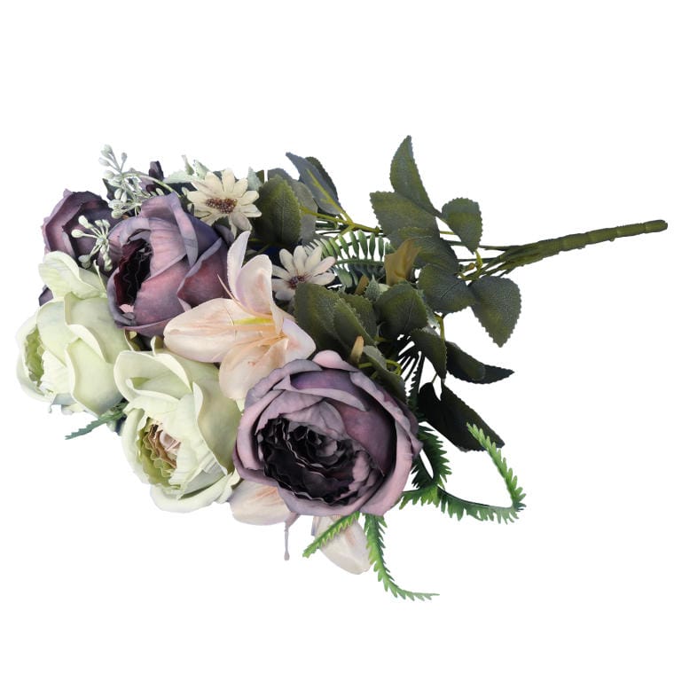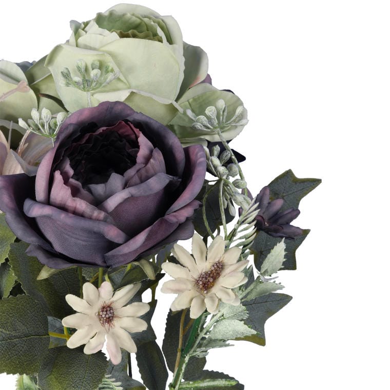Bukiet sztucznych kwiatów to niezwykle elegancka kompozycja, w której harmonijnie łączą się różnorodne odmiany róż, lilii oraz subtelne dodatki w urzekającym połączeniu pudrowej zieleni z fioletem. Oferująca świeżość i styl, ta starannie wykonana aranżacja ma wysokość 60 cm, co czyni ją doskonałym wyborem do ozdabiania różnorodnych wnętrz. Idealnie sprawdzi się jako efektowny element dekoracyjny w salonie, oryginalny akcent na stole czy stylowy dodatek do biura. Dzięki wysokiej jakości materiałów, bukiet zachowuje swój urok przez długi czas, wprowadzając do każdego pomieszczenia elegancję i przytulność. Niezależnie od okazji, ten wyjątkowy bukiet doda charakteru i stworzy unikalną atmosferę w Twoim otoczeniu.