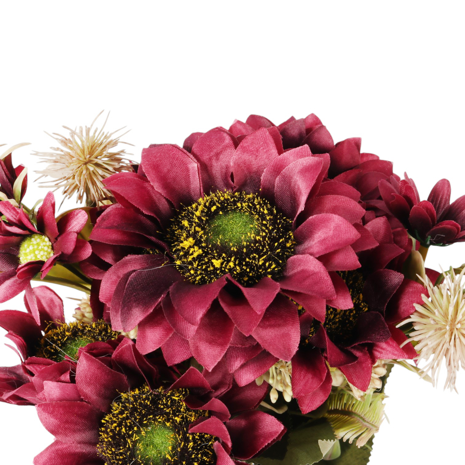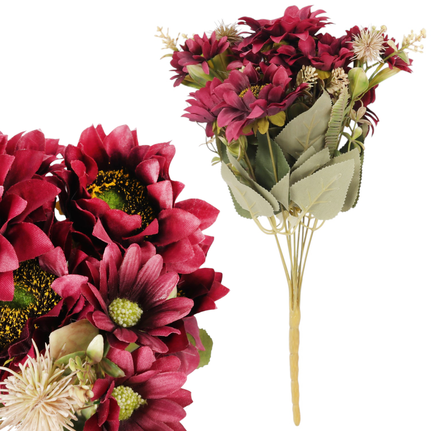 ☀️ Bukiet Sztucznych słoneczników, to doskonały wybór dla osób pragnących dodać elegancji i uroku każdemu wnętrzu. Z wysokością ok. 43 cm, ten stylowy bukiet składa się z 9 gałązek z efektownymi kwiatami, których średnica wynosi od ok.9 cm. Dzięki starannemu wykonaniu, sztuczne słoneczniki zachowują swój świeży wygląd przez długi czas, co czyni je idealnym rozwiązaniem do wzbogacenia aranżacji wnętrz.