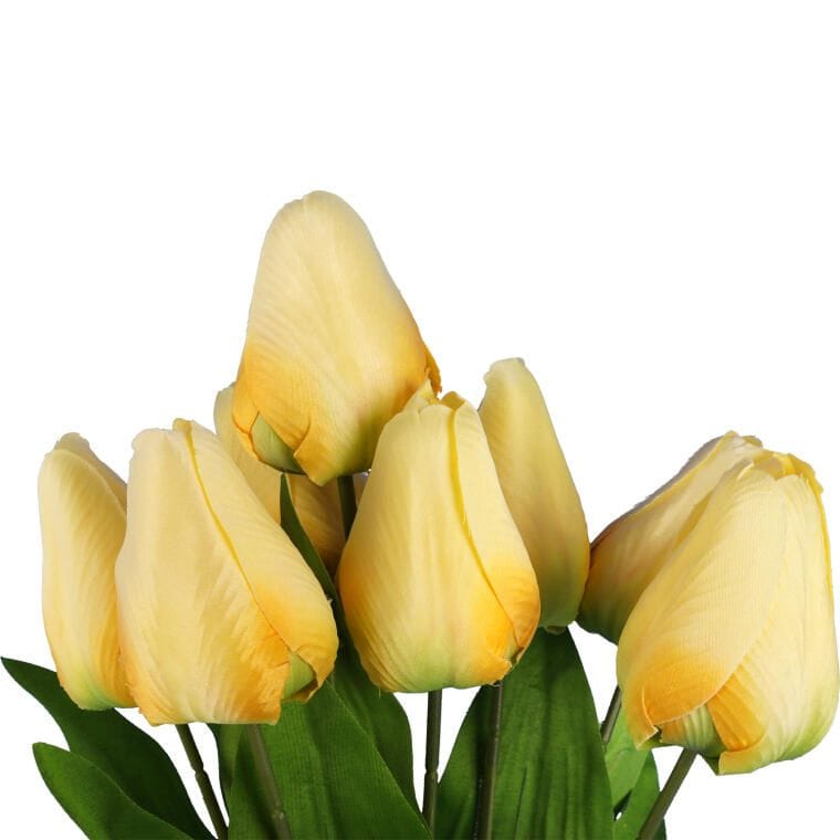 Przedstawiamy sztuczny bukiet tulipanów składający się z 9 realistycznych kwiatów, które swoją wysoką jakością materiału doskonale imitują prawdziwe rośliny. Ten efektowny bukiet tulipanów jest idealnym rozwiązaniem dla każdego, kto pragnie dodać eleganckiego akcentu do swojego wnętrza. Wysoka precyzja wykonania sprawia, że sztuczne tulipany prezentują się niezwykle naturalnie, a ich piękno nie ustępuje żywym kwiatom. Doskonale sprawdzą się jako samodzielna dekoracja lub wkomponowane w różnorodne aranżacje florystyczne, dodając świeżości i koloru w każdym pomieszczeniu. Bukiet tulipanów o długości 44 cm świetnie udekoruje stół, wazon, regał czy inne miejsca, wprowadzając do Twojego otoczenia elegancki i odświeżający element dekoracyjny.