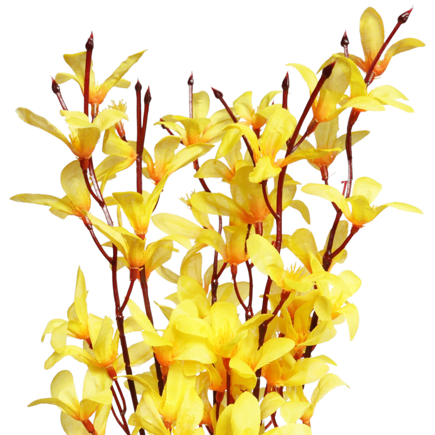 Bukiet sztucznych kwiatów w postaci wiosennych forsycji o wysokości 45 cm to wyjątkowa dekoracja, która zachwyca elegancją i naturalnym wyglądem. Wykonany z wysokiej jakości materiałów, do złudzenia przypomina żywe kwiaty, dzięki czemu wprowadza do wnętrza ciepło, przytulność i świąteczny klimat. Bukiet doskonale prezentuje się jako samodzielna ozdoba w wazonie, a także jako element większych kompozycji, stroików czy dekoracji wiosennych, podkreślając ich wyjątkowy charakter. Intensywne kolory kwiatów pięknie komponują się z różnorodnymi dodatkami, tworząc efektowną całość pasującą zarówno do nowoczesnych, jak i tradycyjnych wnętrz. To ponadczasowa dekoracja, która nie wymaga pielęgnacji, a jednocześnie gwarantuje trwały i elegancki efekt wizualny przez wiele sezonów.