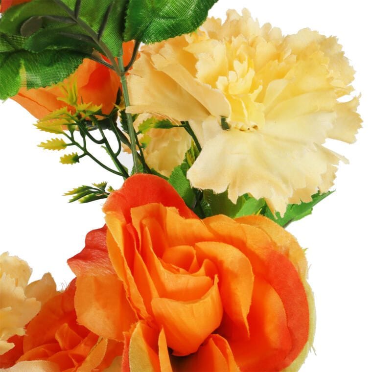 Bukiet sztucznych róż i goździków zachwyca naturalnym wyglądem dzięki wysokiej jakości materiałom. Starannie skomponowana aranżacja doskonale sprawdzi się jako dekoracja wnętrz, balkonów oraz miejsc pamięci, nadając im wyjątkowy charakter. Bukiet świetnie prezentuje się samodzielnie, ale równie dobrze komponuje się w większych aranżacjach, dodając im subtelnej elegancji. Jego wysokość 52 cm i średnica 10 cm.