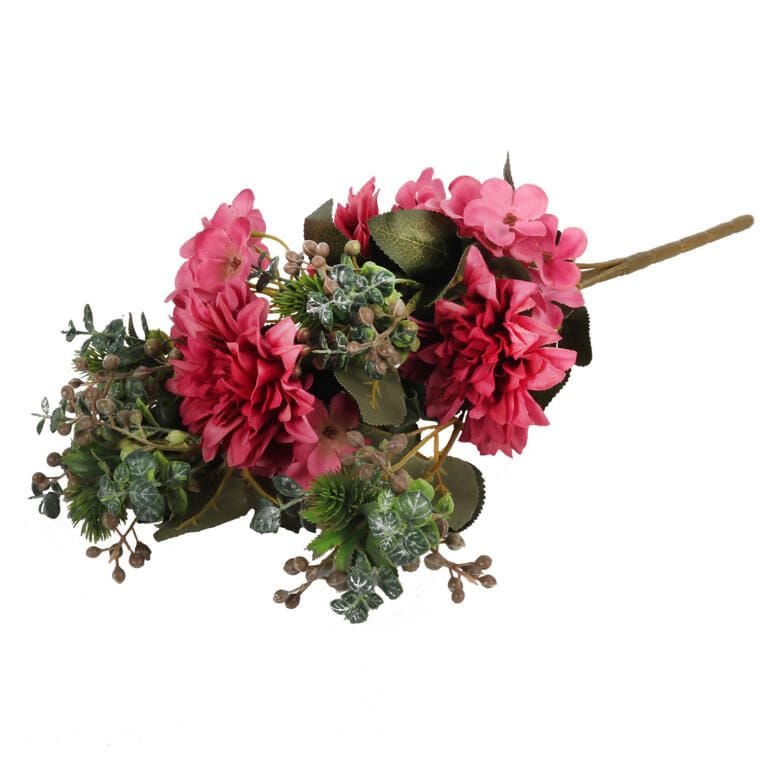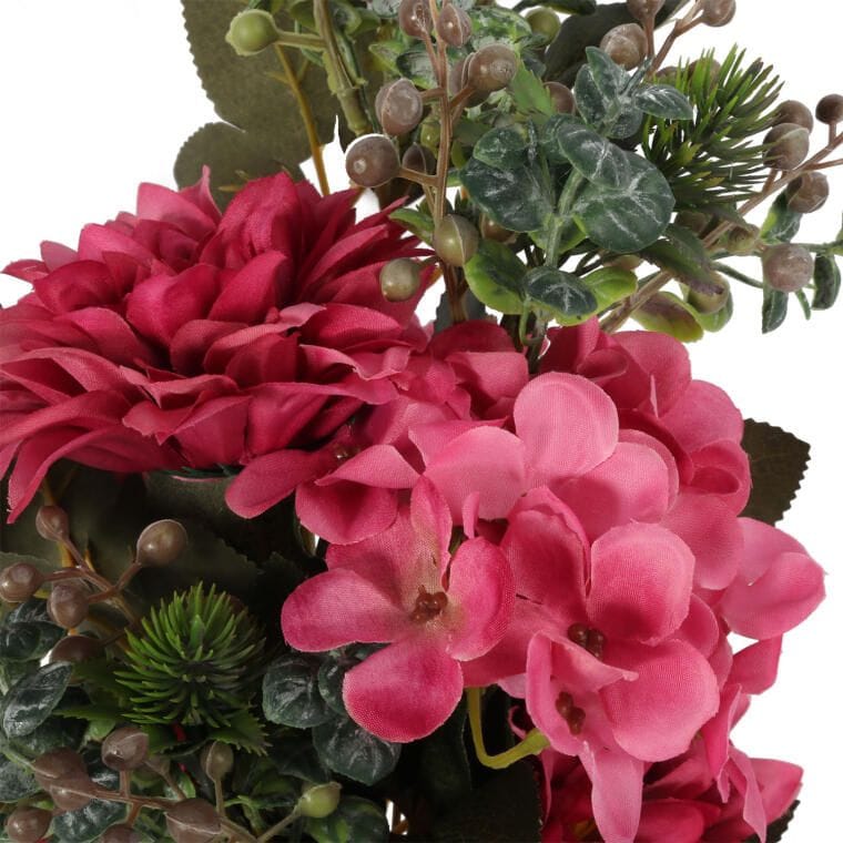 Sztuczny bukiet dalia i hortensja o wysokości 48 cm to elegancka i trwała dekoracja, która do złudzenia przypomina naturalne kwiaty. Wykonany z wysokiej jakości materiałów, zachowuje realistyczny wygląd płatków i liści, dzięki czemu prezentuje się pięknie zarówno w domu, jak i w ogrodzie. Bukiet świetnie sprawdza się jako samodzielna ozdoba w wazonie, w kompozycjach kwiatowych, a także jako elegancka dekoracja nagrobna. Nie wymaga podlewania ani pielęgnacji, pozostając estetyczny przez wiele sezonów. Doskonale komponuje się z aranżacjami w klasycznym, nowoczesnym czy subtelnym stylu naturalnym. To ponadczasowa dekoracja, która wprowadza do otoczenia kolor, świeżość i harmonijną elegancję.