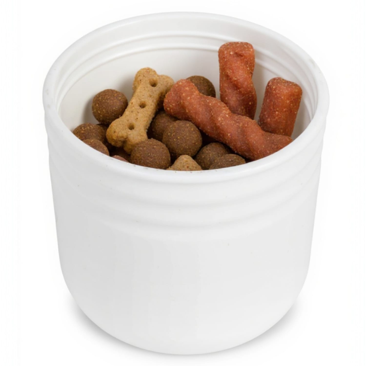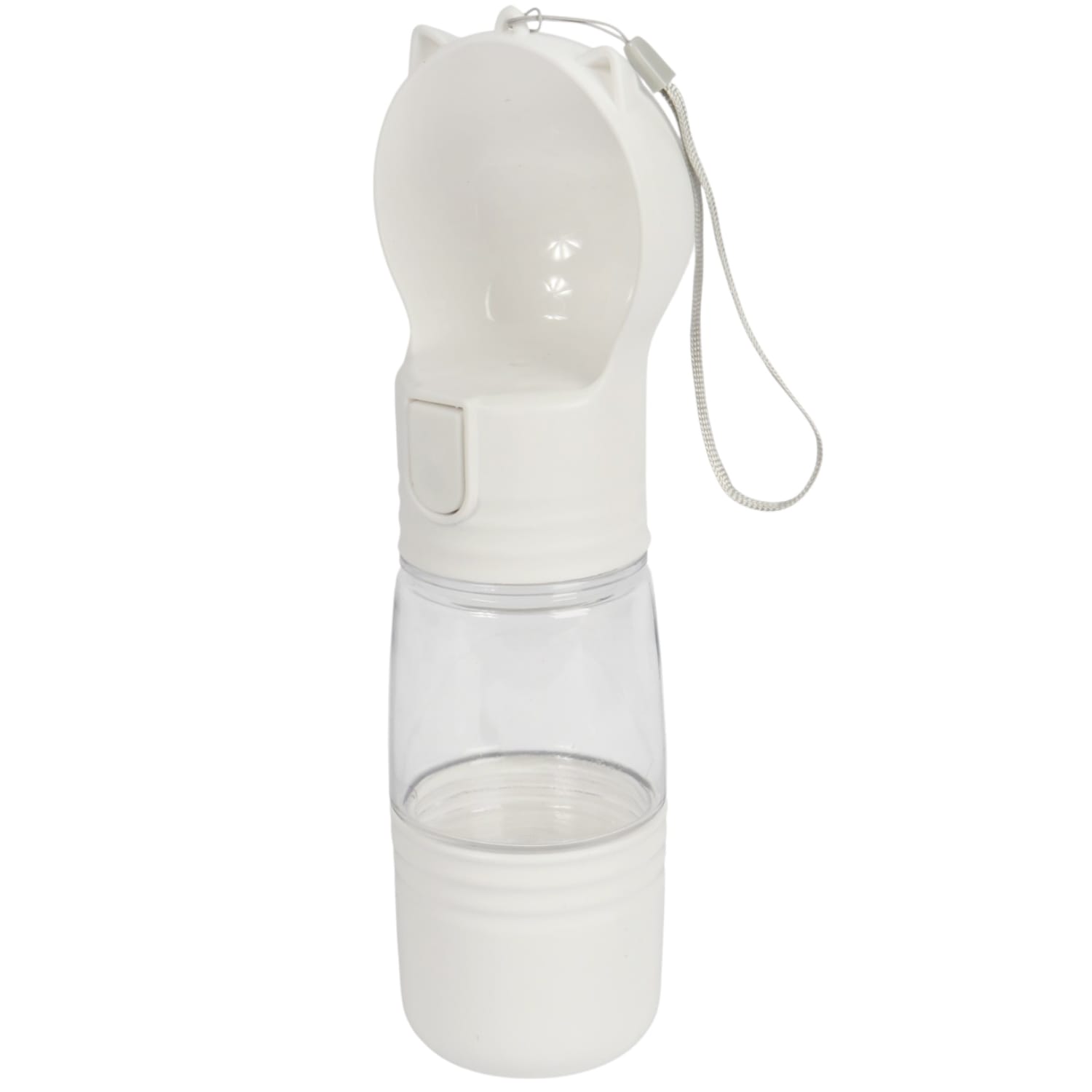 Praktyczna butelka turystyczna 3w1 dla psa i kota w kolorze BIAŁYM – poidło, pojemnik na karmę i miseczka w jednym! Idealna na spacery, podróże i treningi. Wykonana z bezpiecznych, szczelnych materiałów, lekka i wygodna w użyciu. Dzięki niej Twój pupil zawsze ma dostęp do świeżej wody i ulubionej karmy – gdziekolwiek jesteście!