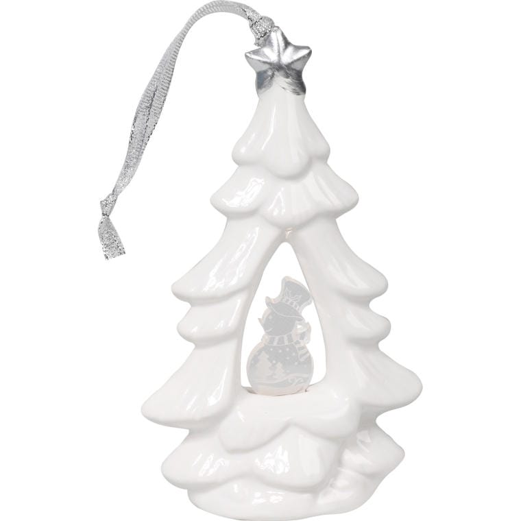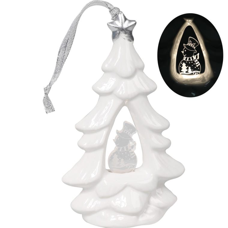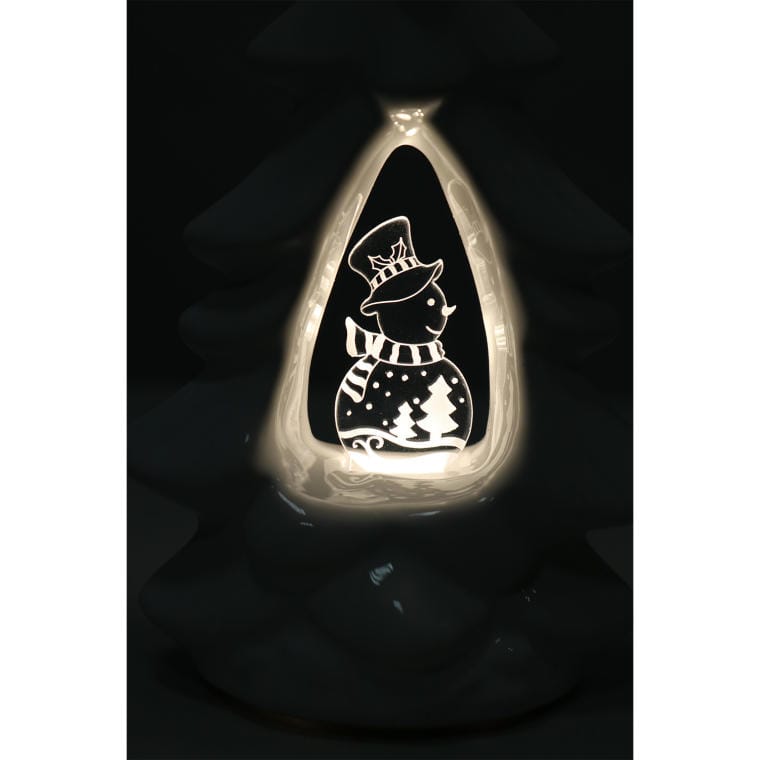 Choinka ceramiczna z podświetlanym bałwankiem LED, biała, 15 cm.