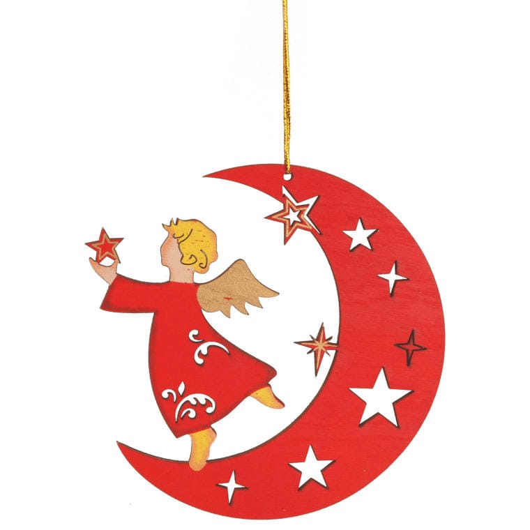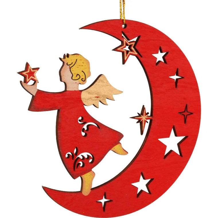 Czerwona Drewniana Zawieszka Świąteczna – Anioł na Księżycu