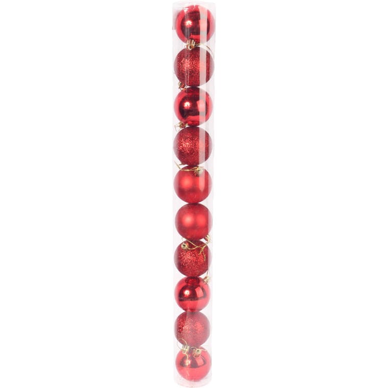 Czerwone Bombki Bożonarodzeniowe – Komplet 10 Sztuk w Tubie, Plastikowe z Brokatem, Matowe i z Połyskiem