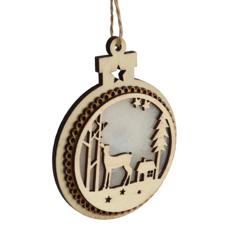 Drewniana zawieszka w kształcie płaskiej bombki z oświetleniem LED to elegancka i nowoczesna dekoracja, idealna na świąteczny czas. O wymiarach 11×10,5 cm, ta stylowa zawieszka doskonale sprawdzi się jako ozdoba choinkowa, a także jako efektowny akcent w oknie lub na świątecznym stole. Oświetlenie LED emituje ciepłe światło, które tworzy przytulną atmosferę w każdym wnętrzu, podkreślając magię świąt. Zasilana bateriami, jest niezwykle praktyczna i łatwa w użyciu, co umożliwia jej zawieszenie w dowolnym miejscu bez potrzeby dostępu do gniazdka. Ta drewniana zawieszka z oświetleniem LED łączy w sobie naturalny urok drewna z nowoczesną technologią, co czyni ją idealnym dodatkiem do każdej kolekcji świątecznych dekoracji. Urokliwy design i funkcjonalność sprawiają, że ta zawieszka to doskonały wybór dla osób poszukujących wyjątkowych akcentów do swojego domu w okresie świątecznym.