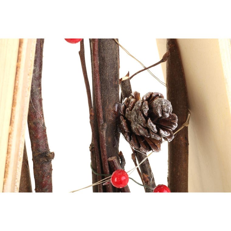 Stojąca drewniana choinka w kształcie trójkąta to elegancka dekoracja, która doda wyjątkowego uroku Twojemu wnętrzu. Wyposażona w 10 lamp LED, ta choinka zasilana na dwie baterie typu paluszki zapewnia delikatne, ciepłe oświetlenie, które wprowadza przytulną atmosferę. Jej prosta forma została ozdobiona naturalnymi gałęziami, szyszkami oraz jarzębiną, co sprawia, że idealnie wpisuje się w świąteczny klimat. Dzięki wymiarom 56x20x6 cm, doskonale nadaje się do postawienia na stole, komodzie czy oknie, tworząc piękną ozdobę, która zachwyci każdego.