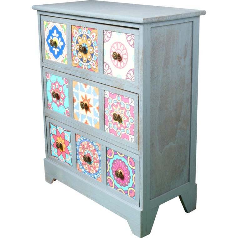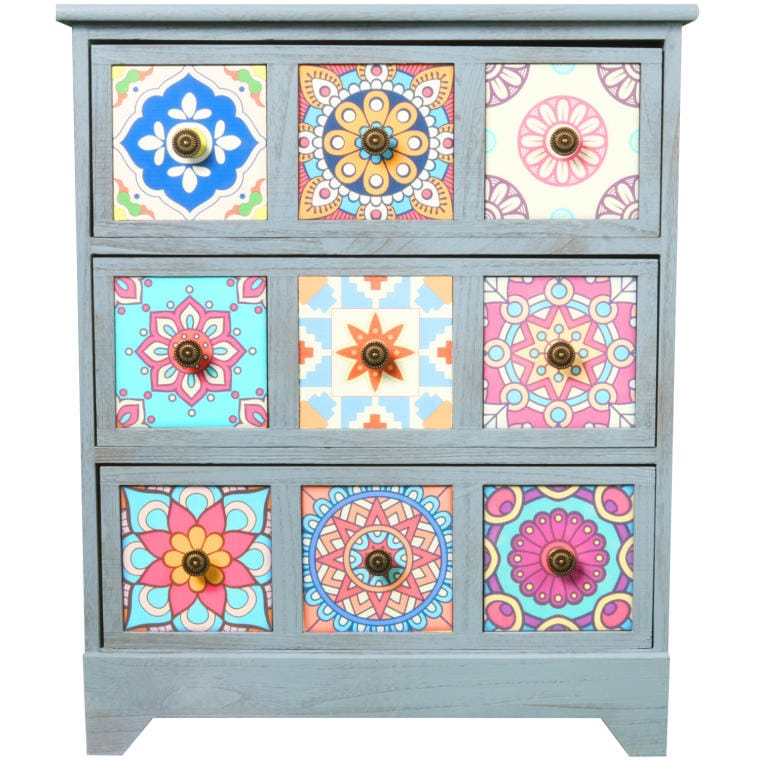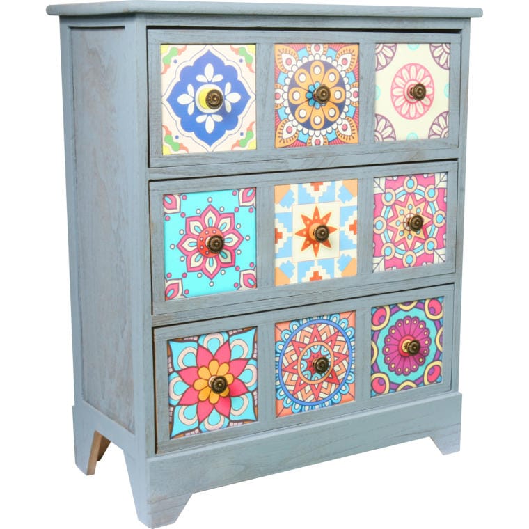 Przedstawiamy drewnianą, kolorową komodę-szafkę z trzema szufladami, która zachwyca swoim retro stylem inspirowanym Vintage. Każda szuflada wyróżnia się trzema malowanymi kwadratami, wykonanymi techniką decoupage, w różnych, przyciągających wzrok kolorach, co nadaje jej unikalny charakter. Dodatkowo, trzy okrągłe metalowe uchwyty sprawiają, że każda szuflada wygląda jak osobna, kwadratowa jednostka, co zwiększa jej atrakcyjność wizualną.