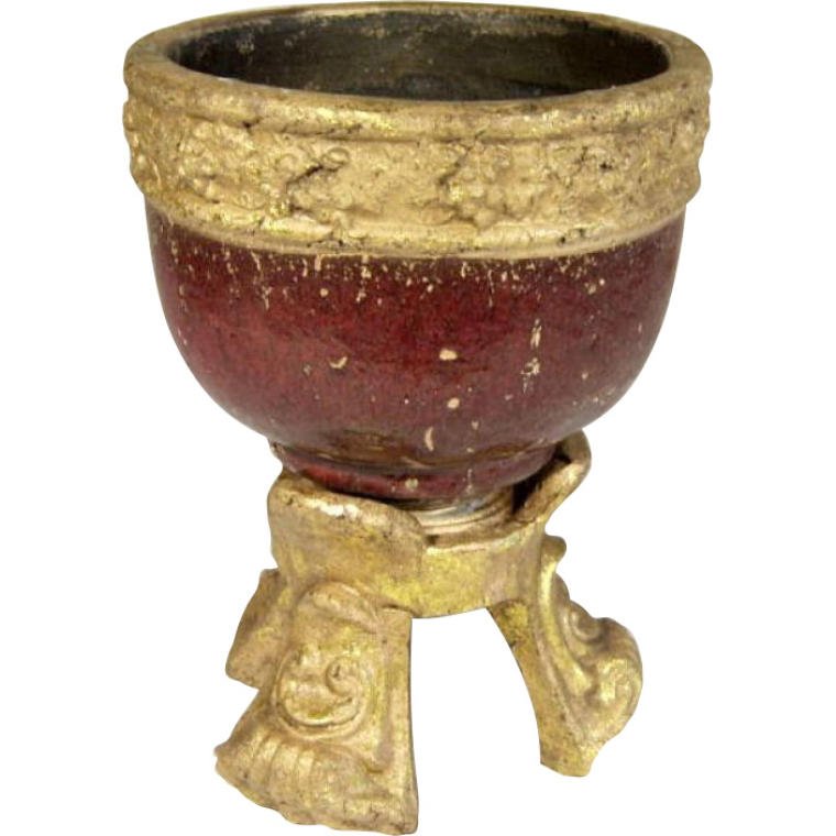 Oto duża waza w eleganckim bordowym kolorze, ozdobiona złoconym motywem, który wznosi się ku górze. Charakteryzuje się masywnymi nogami, co nadaje jej stabilności i wyjątkowego charakteru. Ta ciężka waza nie tylko zachwyca swoim wyglądem, ale także doskonale sprawdzi się jako osłonka na doniczkę, idealnie eksponując rośliny.