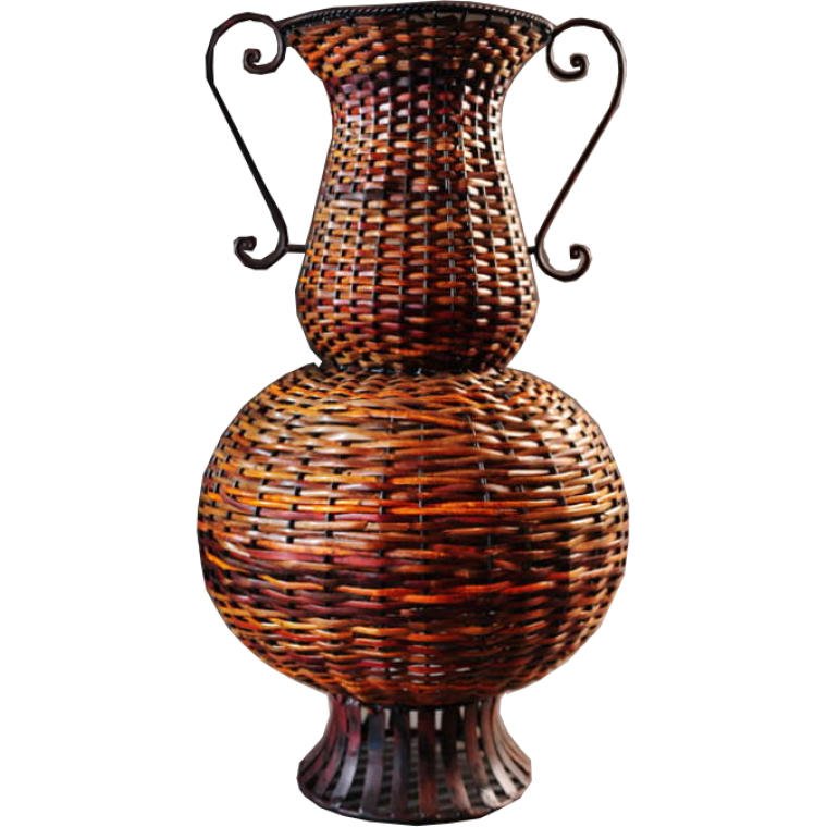 Oto imponujący wazon z wikliny w ciepłym, brązowym odcieniu, misternie wykończony akcentami z metaloplastyki, które dodają mu charakteru i elegancji. Wazon wyróżnia się solidnymi uchwytami po bokach, nadającymi mu funkcjonalność i styl. Jego pokaźny rozmiar, 65 cm wysokości i 32 cm średnicy, sprawia, że idealnie sprawdzi się jako element dekoracyjny w przestronnych wnętrzach, wprowadzając naturalny, rustykalny klimat.