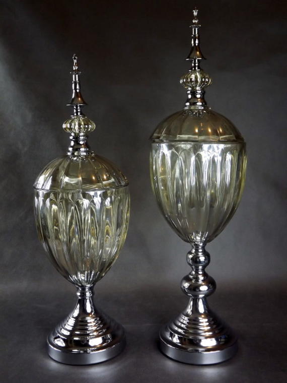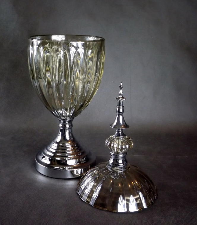Szalenie elegancka patera z przykryciem to wyrafinowany element dekoracyjny, który zachwyca połączeniem przydymionego kryształu z chromem, tworząc subtelny, ale jednocześnie efektowny akcent w każdym wnętrzu. Jej wysokość wynosząca 55 cm sprawia, że doskonale nadaje się do wyeksponowania na stole, komodzie lub w witrynie, przyciągając uwagę gości i dodając elegancji każdemu przyjęciu. Starannie zaprojektowany spód patery, pokryty antypoślizgową materią, zapewnia stabilność i bezpieczeństwo podczas użytkowania, eliminując ryzyko przesunięcia się na powierzchni. Jako jedna z dwóch wersji w tej luksusowej kolekcji, niższa patera harmonijnie komponuje się z innymi elementami, oferując możliwości różnorodnych aranżacji. To idealny wybór dla osób, które pragną wprowadzić do swojego domu szczyptę klasy i stylu, sprawiając, że każda chwila spędzona przy stole staje się wyjątkowa.