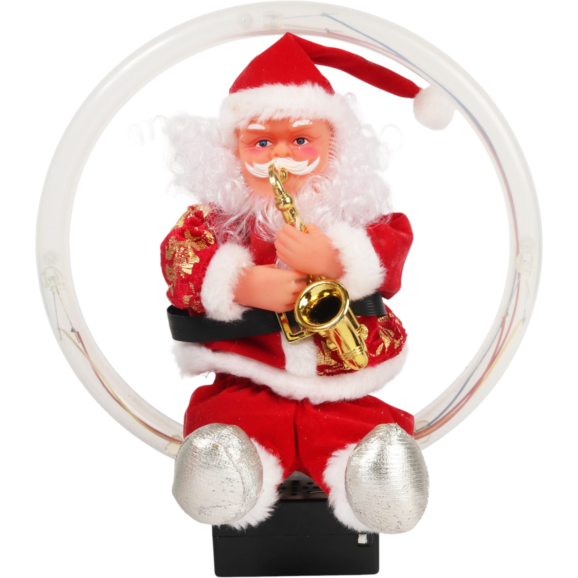- Grający Święty Mikołaj: Ta animowana dekoracja świąteczna przedstawia grającego na trąbce Świętego Mikołaja, który porusza się w oświetlonym kole.