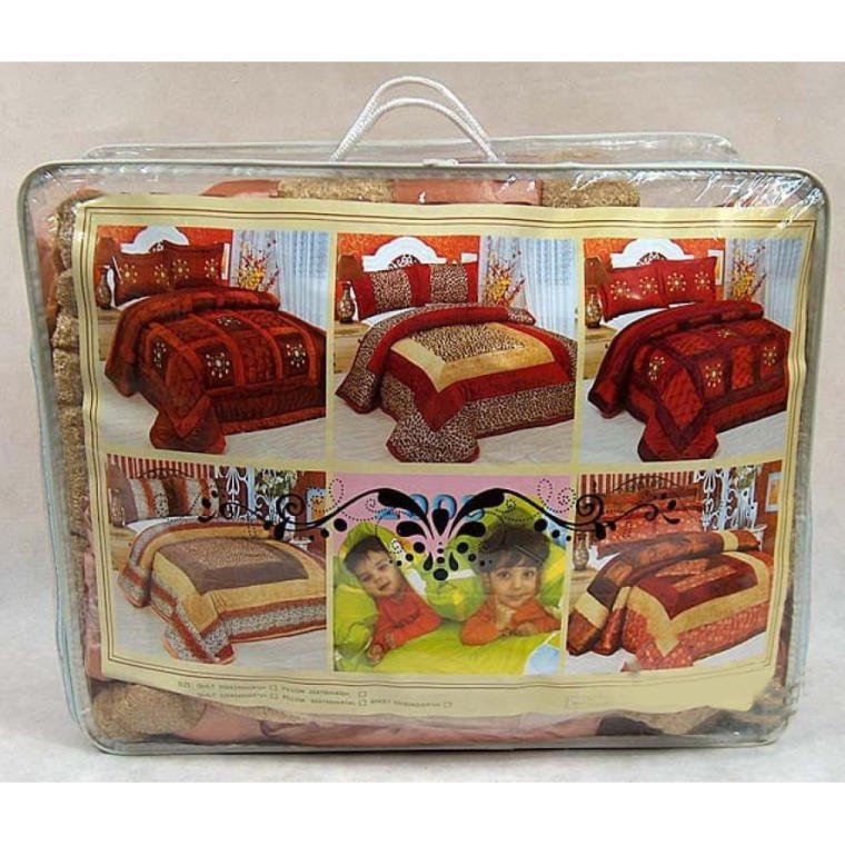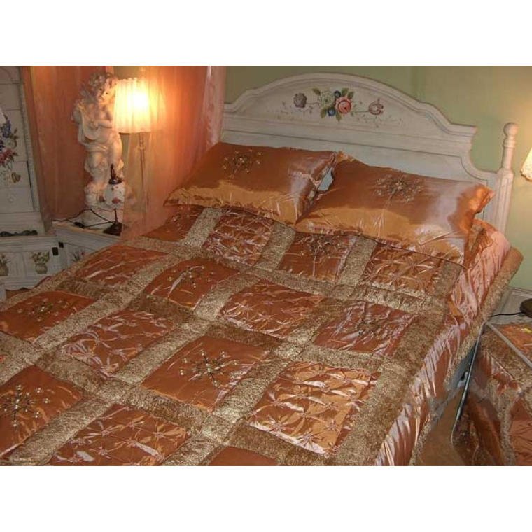 Gruba Narzuta na Łóżko w Kolorze Łososia z Satynowym Przeszyciem i Haftem – zestaw z Poduszkami