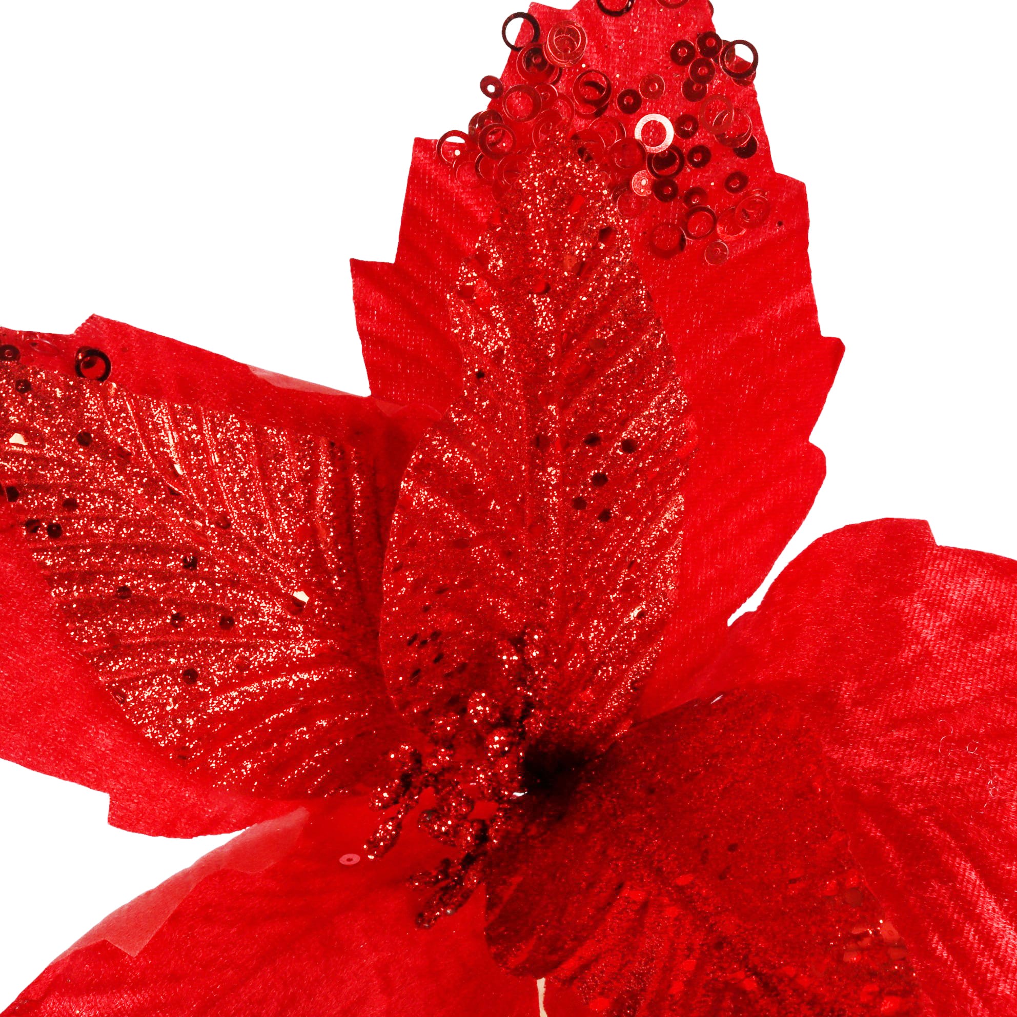Duży kwiat welurowy w kolorze czerwonym z czerwonym brokatem i cekinami. Kwiat do dekoracji wnętrz w okresie świąteczno – zimowym, idealny także jako ozdoba w kompozycjach florystycznych.