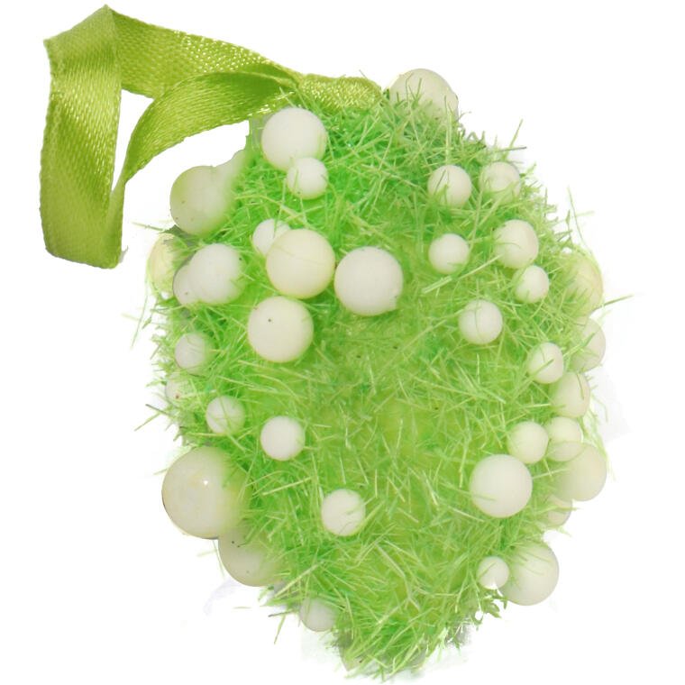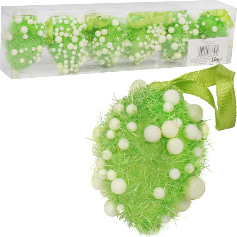 Komplet 6 jajek z sizalu w kolorze zielonym, ozdobionych białymi kulkami, to efektowna wiosenna dekoracja, która wprowadza świąteczną atmosferę do każdego wnętrza. Jajka mają wymiary 6 x 4 cm i są zapakowane w praktyczny boks, co sprawia, że doskonale nadają się na prezent lub do przechowywania.