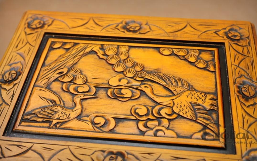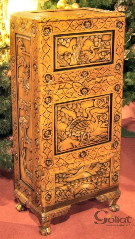 Ta wyjątkowa szafka drewniana to prawdziwy przykład mistrzowskiego rzemiosła, wykonana z najwyższej jakości drewna w eleganckim kolorze orzechowym, który nadaje jej ciepły i klasyczny wygląd. Misternie ręcznie rzeźbiona, z dbałością o każdy szczegół, przyciąga wzrok swoimi wyrafinowanymi zdobieniami, które podkreślają jej unikalny charakter. Szafka została zaprojektowana z myślą o funkcjonalności i estetyce, oferując dwie przestronne szuflady, idealne do przechowywania różnych drobiazgów, oraz dwie półki, które umożliwiają ekspozycję dekoracji, książek lub innych przedmiotów. Dzięki swojemu stylowemu designowi i solidnej konstrukcji, ta szafka doskonale wpisuje się w różnorodne aranżacje wnętrz, od klasycznych po nowoczesne, stanowiąc nie tylko praktyczny mebel, ale także piękną dekorację każdego pomieszczenia.