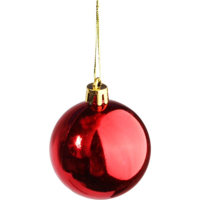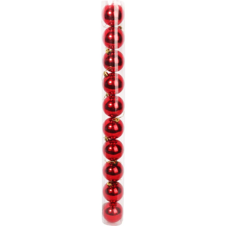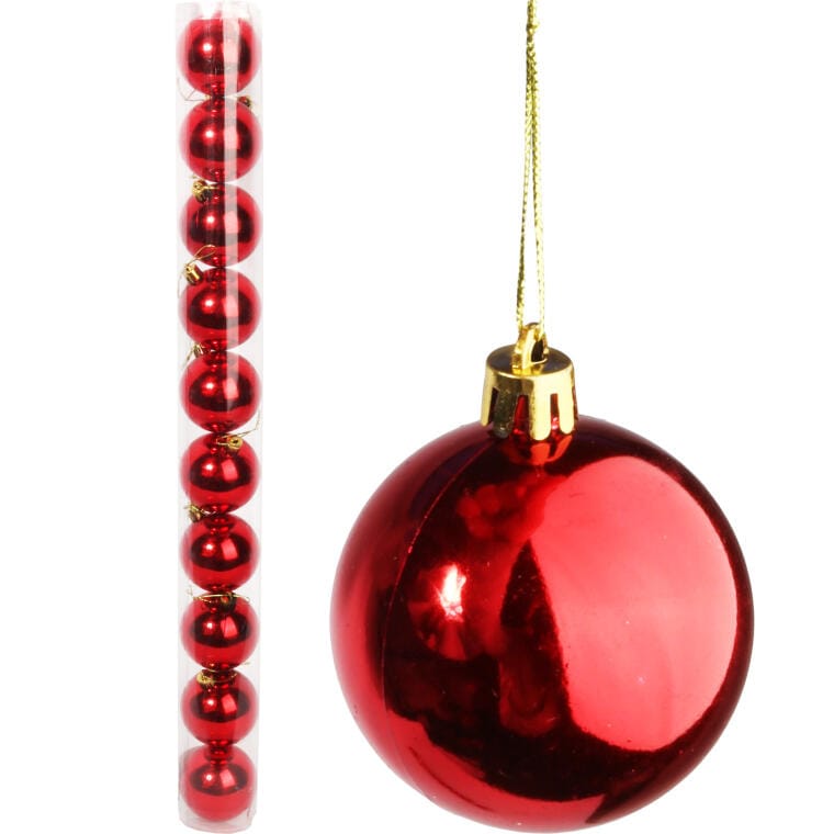 Bombki 10 sztuk w tubie Bombki w kolorze czerwonym z połyskiem to świetny i bardzo elegancki element do dekoracji bożonarodzeniowego drzewka, które przyciąga wzrok i zachwyca klimatem. Roztacza aurę wyjątkowych, rodzinnych świąt, a ta doskonale przenika do wszystkich domowników i gości. Bombki plastikowe o bardzo starannym wykonaniu. Zastosowanie takiego materiału jest alternatywą dla klasycznych, szklanych ozdób, które nie są tak trwałe i odporne na zniszczenie. Wysokość: 6 cm Opakowanie: 10 sztuki Kolor: czerwony