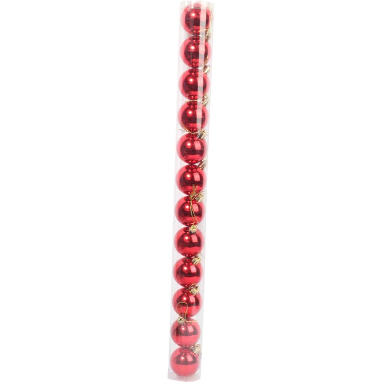 Bombki 12 sztuk Bombki plastkowe w kolorze czerwonym 12 szt z połyskiem, to świetny i bardzo elegancki element do dekoracji bożonarodzeniowego drzewka, które przyciągnie wzrok i zachwyci klimatem. Roztoczy aurę wyjątkowych, rodzinnych świąt, a ta doskonale przeniknie do wszystkich domowników i gości. Bombki plastikowe o bardzo starannym wykonaniu. Zastosowanie takiego materiału jest alternatywą dla klasycznych, szklanych ozdób, które nie są tak trwałe i odporne na zniszczenie. Wysokość: 5 cm Opakowanie: 12 sztuki Kolor: czerwony