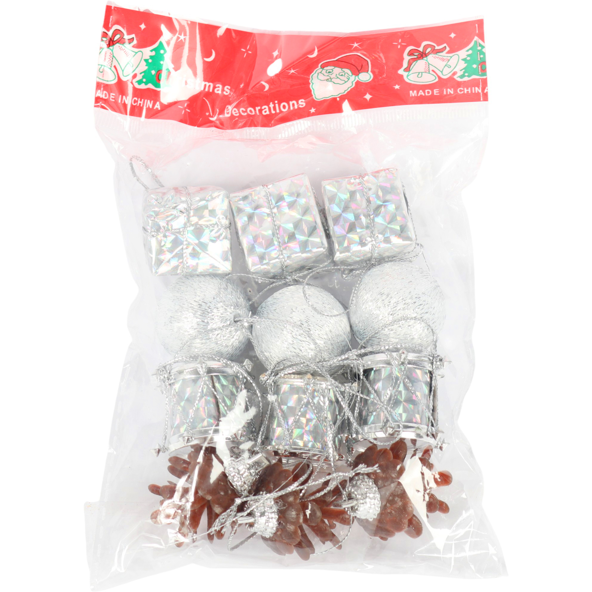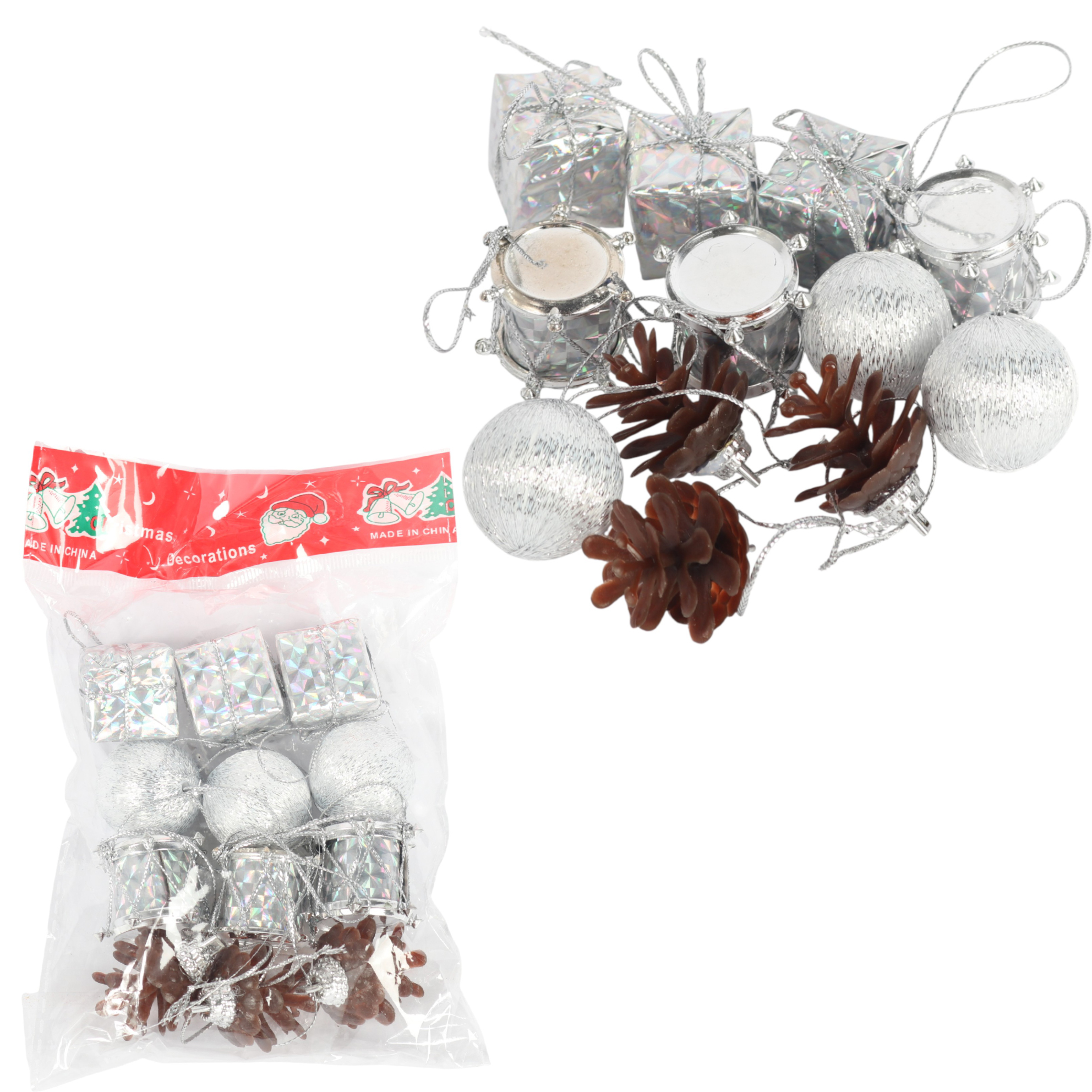 Komplet 12 ozdób bożonarodzeniowych mix z szyszkami SREBRNE