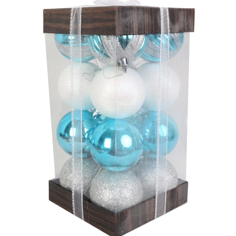 Komplet 16 Bombek Plastikowych 6 cm w Odcieniach Błękitu i Bieli z Brokatem w Eleganckim Opakowaniu