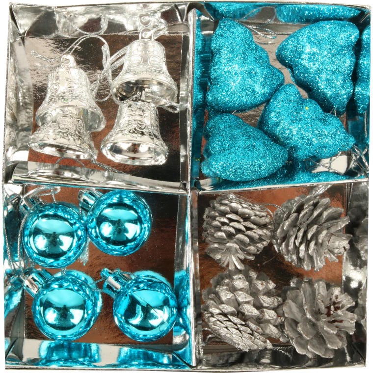 Komplet 16 Zawieszek Świątecznych – Dzwonki, Szyszki, Choinki, Bombki w Kolorze Turkusowo-Srebrnym