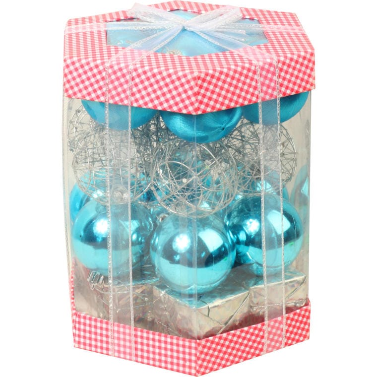 Komplet 28 Zawieszek na Choinkę Mix: Bombki Jedwabne, Kule Druciane, Prezenciki, Bombki Plastikowe w Kolorze Turkusowo-Srebrnym