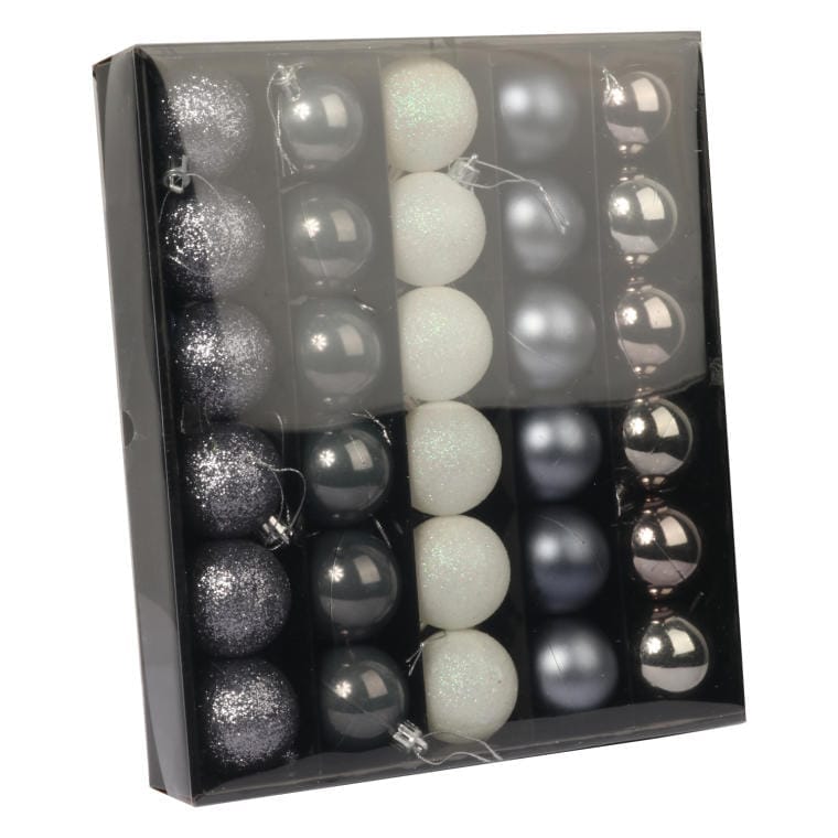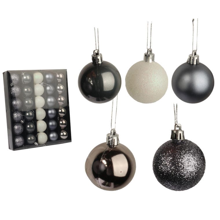 Odkryj magiczny urok świątecznego sezonu z kompletem 30 bombek plastikowych w eleganckich kolorach grafitowym i białym. Każda bombka o średnicy 5 cm to doskonały wybór do dekoracji choinki, wprowadzając subtelną harmonię i styl do Twojego świątecznego wystroju. Te wyjątkowe ozdoby charakteryzują się lekkością i trwałością, co sprawia, że są idealne zarówno do wnętrz, jak i na zewnątrz, nie musisz obawiać się o ich uszkodzenia.