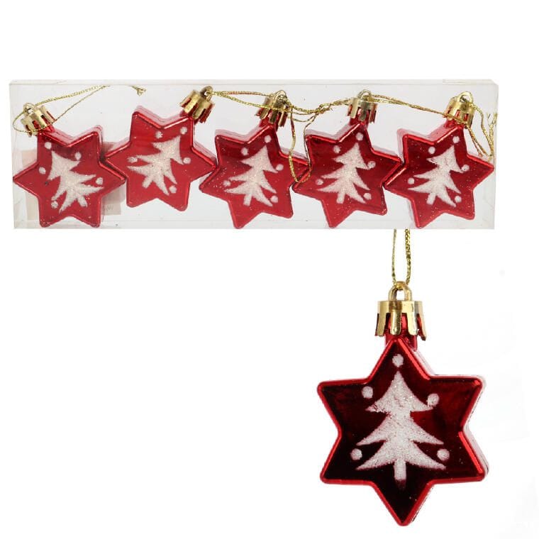 Komplet 5 Czerwonych Bombek w Kształcie Gwiazd z Dekorem Choinkowym