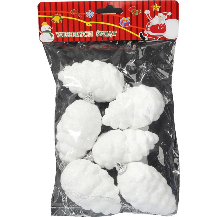 Komplet 6 Białych Styropianowych Szyszek z Srebrnym Brokatem – Dekoracje Świąteczne 8 cm