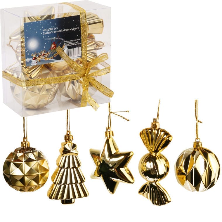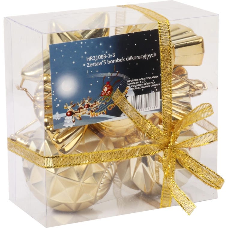 Komplet pięciu bombek plastikowych w kolorze złotym to doskonały wybór na dekorację choinki lub innych świątecznych aranżacji. Każda bombka ma inny kształt, co sprawia, że zestaw jest wyjątkowy i pełen uroku. Wykonane z wysokiej jakości materiałów, bombki są lekkie i trwałe, co ułatwia ich zawieszanie. Złoty kolor dodaje elegancji i blasku, wprowadzając do wnętrza świąteczną atmosferę. Idealnie nadają się zarówno do tradycyjnych, jak i nowoczesnych dekoracji.