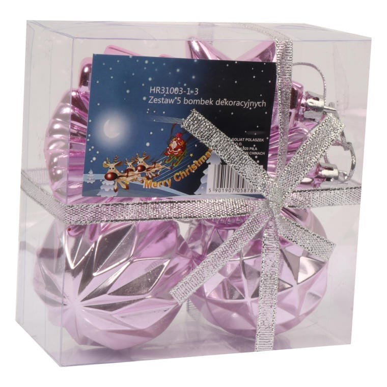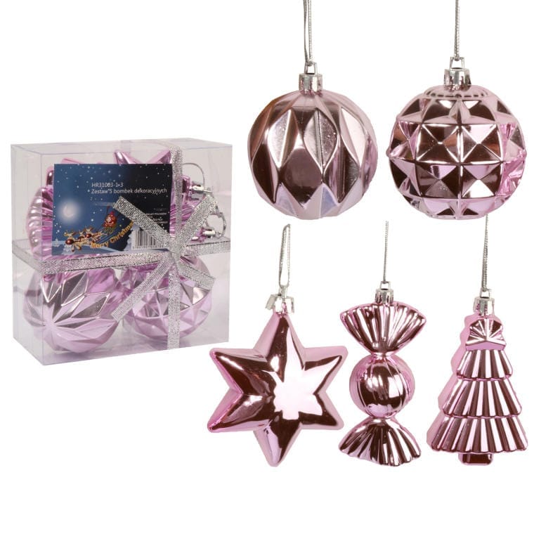 Dodaj odrobinę słodyczy do swojego świątecznego wystroju dzięki kompletowi 5 bombek plastikowych w kolorze różowym, które zachwycają różnorodnością kształtów. Ten urokliwy zestaw to idealny sposób na wprowadzenie delikatnego akcentu do dekoracji choinki, wieńców czy stołów.