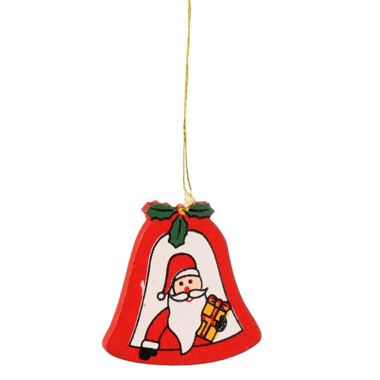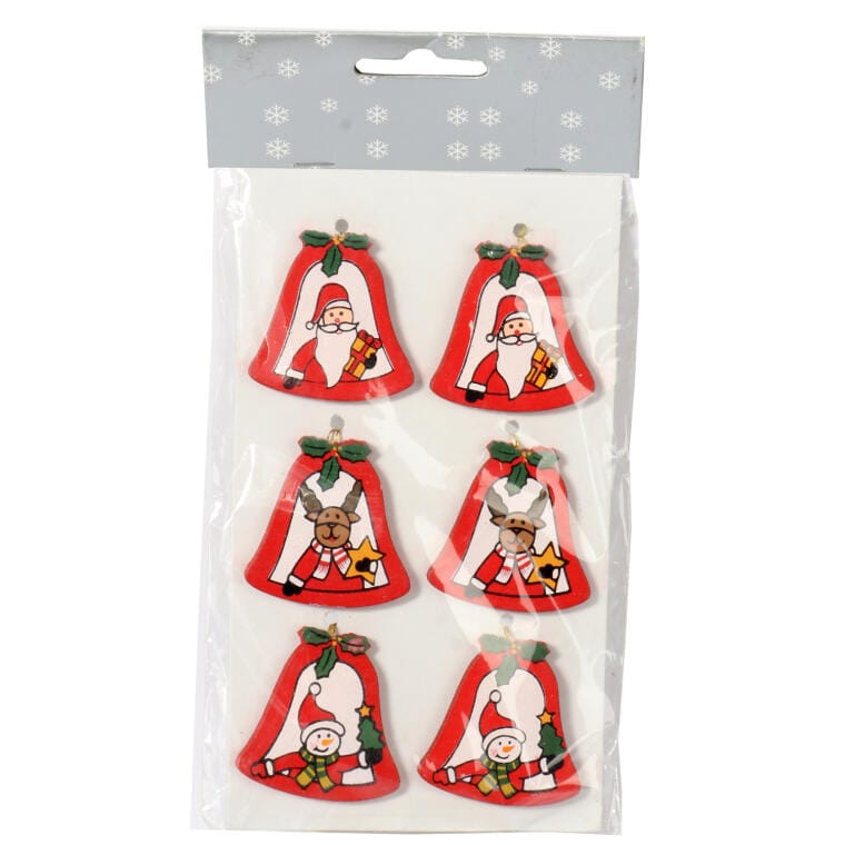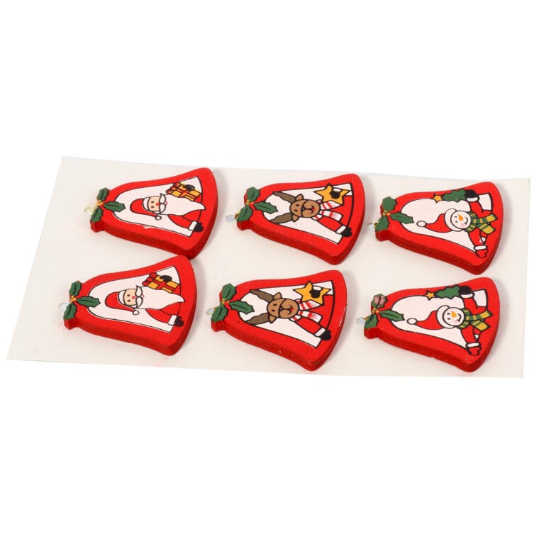 Komplet Czerwonych Drewnianych Zawieszek Dzwonków Świątecznych z Motywem Mikołaja, Bałwana i Renifera