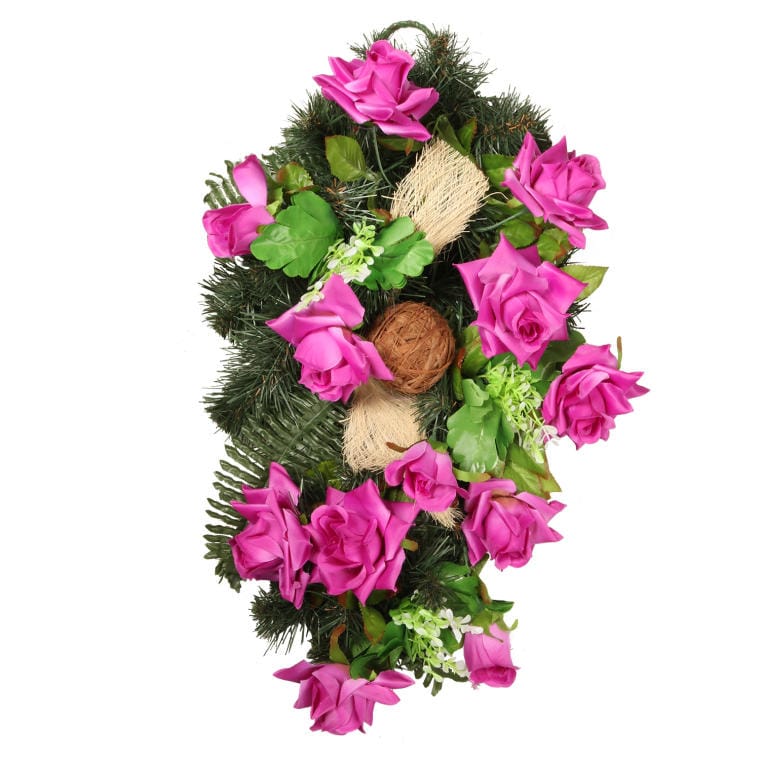 Stroik nagrobny to elegancka kompozycja z róż i suszu, osadzona na podkładzie z gałęzi świerkowych, w pięknym kolorze fioletowym. Ta wyjątkowa dekoracja wprowadza subtelny akcent do przestrzeni pamięci, tworząc godne i pełne szacunku miejsce dla bliskich. Róże, wykonane z wysokiej jakości materiałów, zachwycają trwałością oraz estetyką, a dodatek suszu nadaje naturalnego charakteru całej kompozycji. Stroik nagrobny doskonale sprawdzi się jako ozdoba grobu, wnosząc harmonię i spokój w trudnych chwilach. Dzięki starannie dobranym elementom, ta fioletowa kompozycja stanowi wyjątkowy symbol miłości i pamięci, przynosząc ukojenie w smutnych momentach. Wybierz ten stroik, aby oddać hołd zmarłym w sposób, który odzwierciedli Twój szacunek i pamięć.