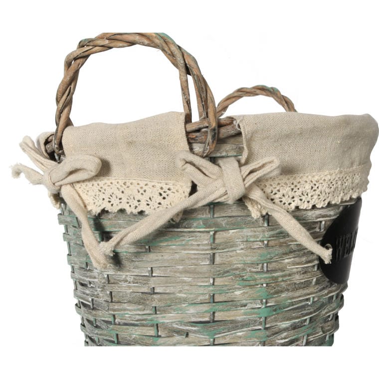 Koszyk Wiklinowy z Uchwytami, Wkładem Lnianym i Dekoracyjnym Napisem WELCOME Szary