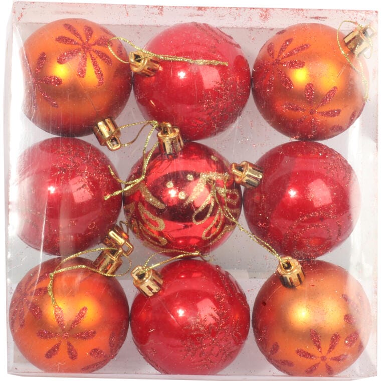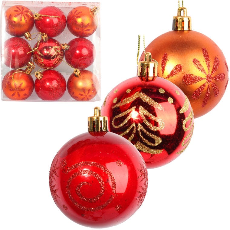 Czerwono-pomarańczowe bombki plastikowe z dekoracyjnym wzorem to elegancki element, który doskonale udekoruje Twoje bożonarodzeniowe drzewko, przyciągając wzrok i tworząc wyjątkowy, świąteczny klimat. Zestaw 9 starannie wykonanych bombek o wysokości 6 cm stanowi świetną alternatywę dla tradycyjnych szklanych ozdób, dzięki czemu są one bardziej odporne na uszkodzenia i trwałe na lata. Ich intensywne kolory oraz dekoracyjne detale wprowadzą ciepłą, rodzinną atmosferę do Twojego domu, budując magię Świąt, która z pewnością zachwyci zarówno domowników, jak i gości. Bombki te idealnie komponują się z innymi ozdobami, dodając choince elegancji i blasku, a dzięki wysokiej jakości wykonania będą świetnie wyglądać przez wiele sezonów. Świetnie pasują do różnych aranżacji świątecznych, niezależnie od stylu Twojego wnętrza.
