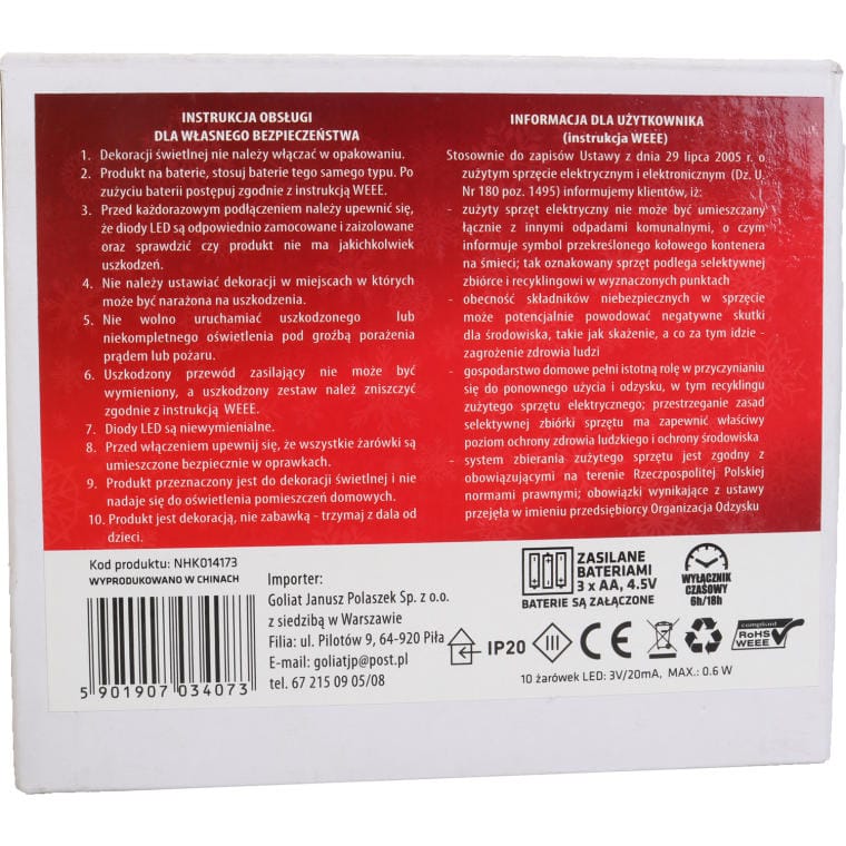Kurtyna świetlna z 10 diodami LED w kształcie gwiazdek o średnicy 11,5 cm to doskonały sposób na stworzenie magicznej atmosfery w Twoim wnętrzu. Zasilana trzema bateriami 1.5V AA (baterie w komplecie), jest niezwykle wygodna w użyciu, a transparentny przewód sprawia, że dekoracja idealnie wkomponuje się w każde otoczenie. Dodatkowo, wyposażona w wyłącznik czasowy z funkcją 6 godzin włączonej pracy oraz 18 godzin wyłączenia, zapewnia oszczędność energii i komfort użytkowania. Oznaczenie IP20 sprawia, że kurtyna świetlna przeznaczona jest do użytku wewnętrznego. Stwórz niezapomniane chwile i nastrojową atmosferę podczas świąt czy innych wyjątkowych okazji dzięki tej efektownej dekoracji!