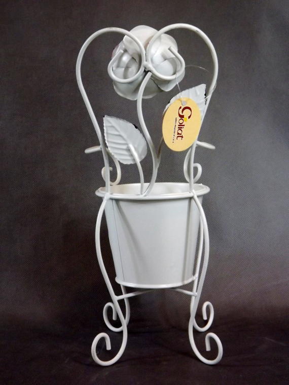 Kwietnik-krzesełko z metaloplastyki to wyjątkowy element dekoracyjny, który zachwyca subtelnym designem inspirowanym stylem prowansalskim. Zdobiony delikatną gałązką róży, kwietnik nie tylko przyciąga wzrok, ale także wprowadza do wnętrza romantyczny klimat.